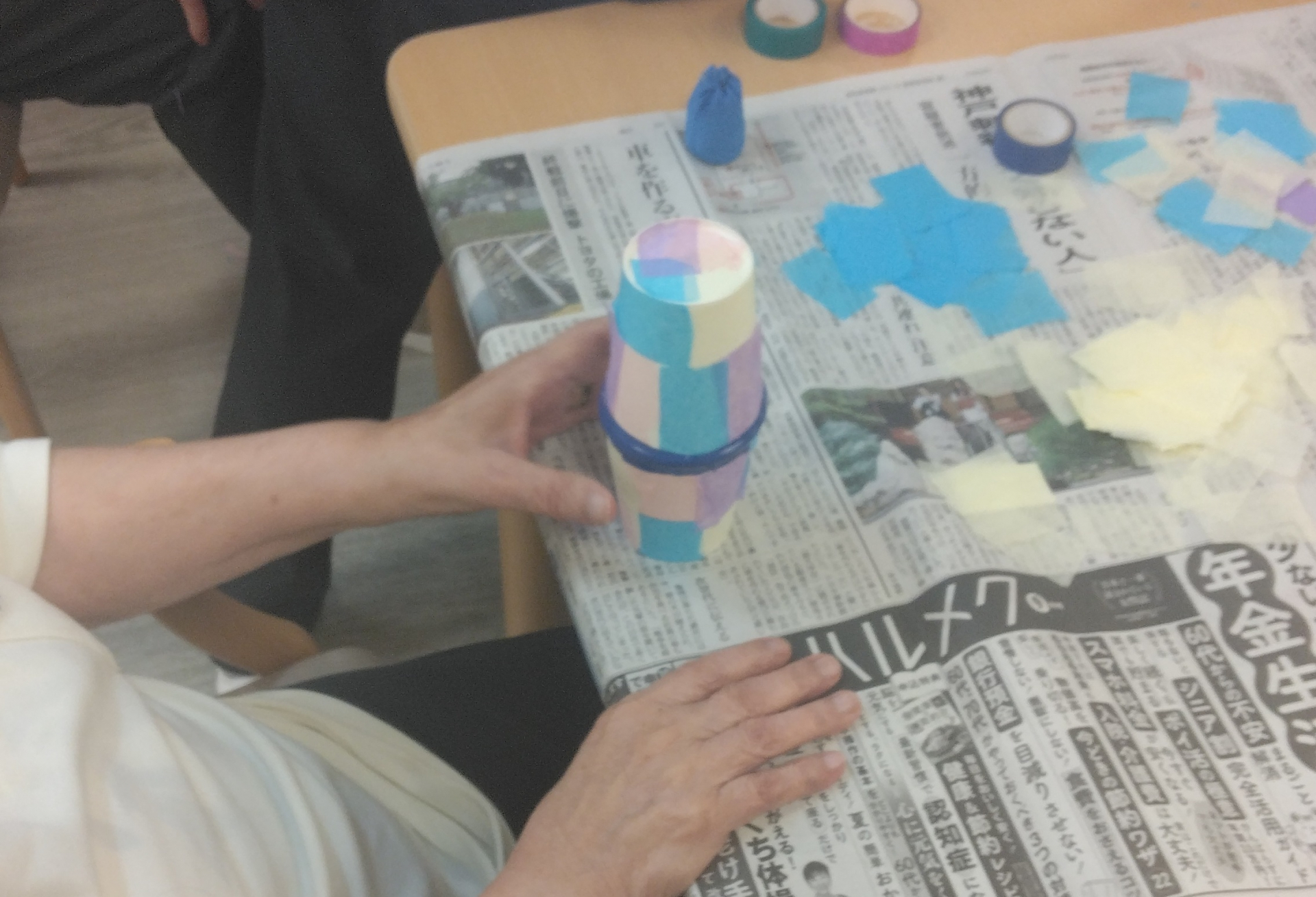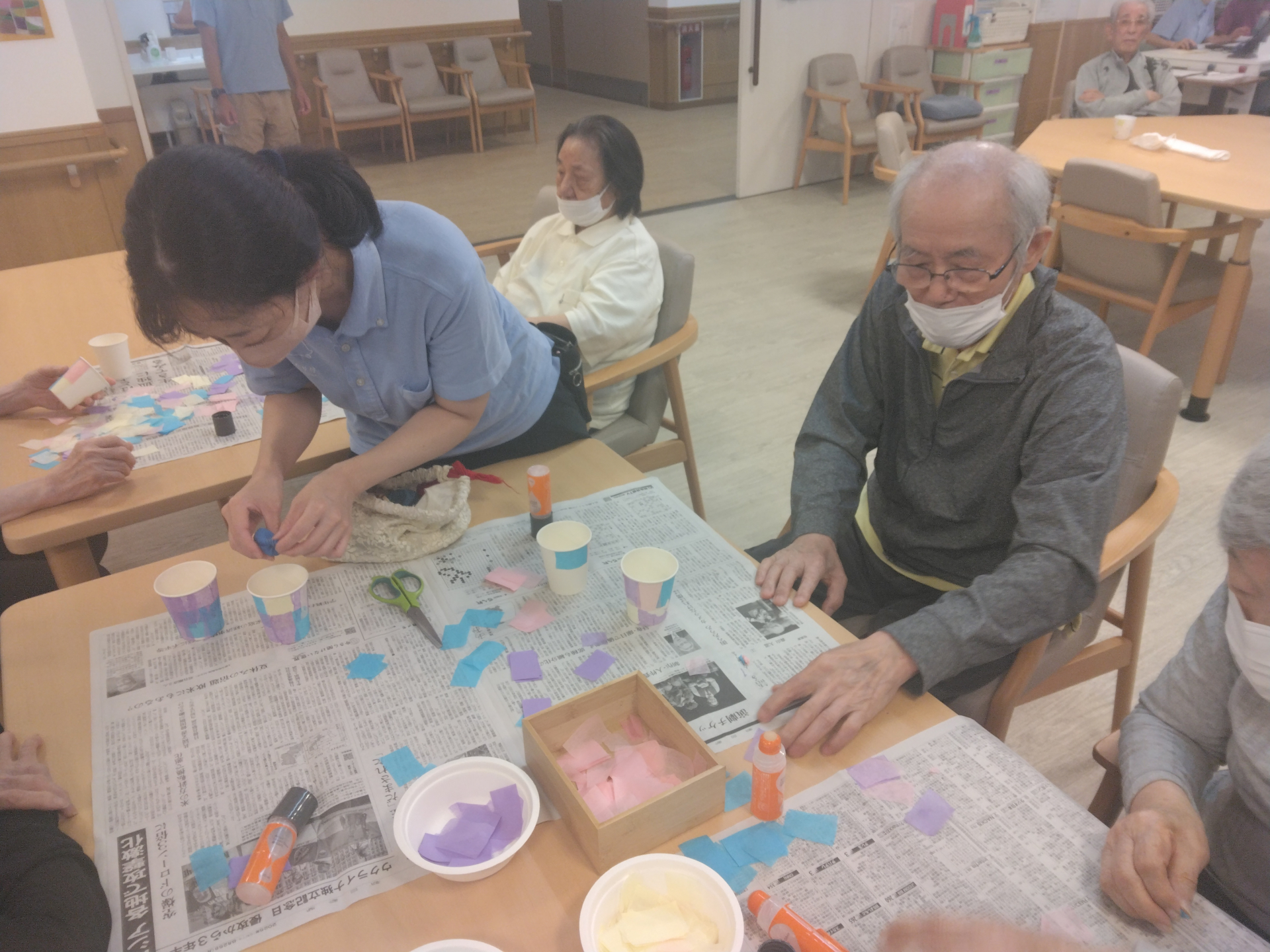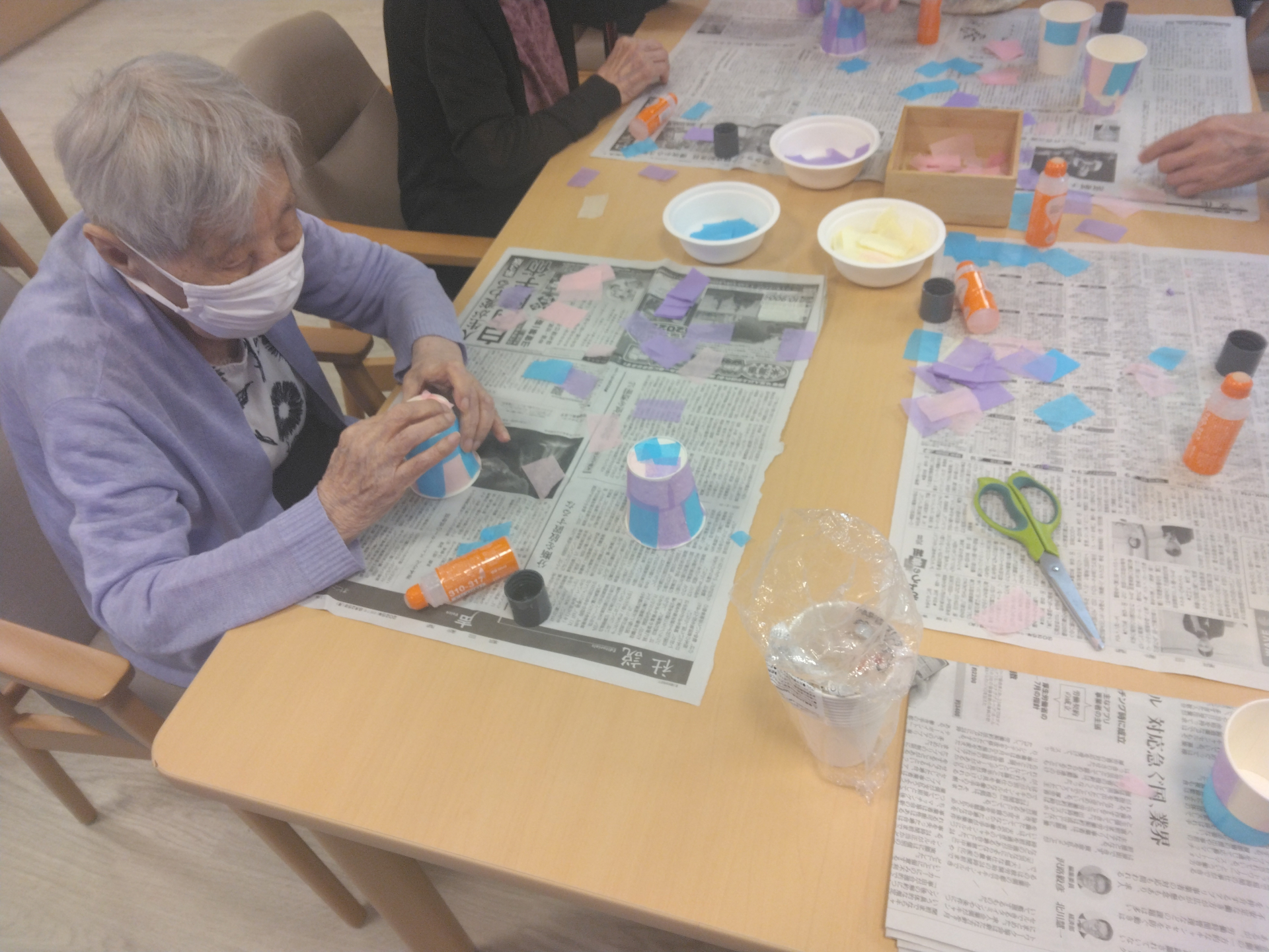 まずは紙コップに色紙を糊で貼り、思い思いの装飾をしていきます!