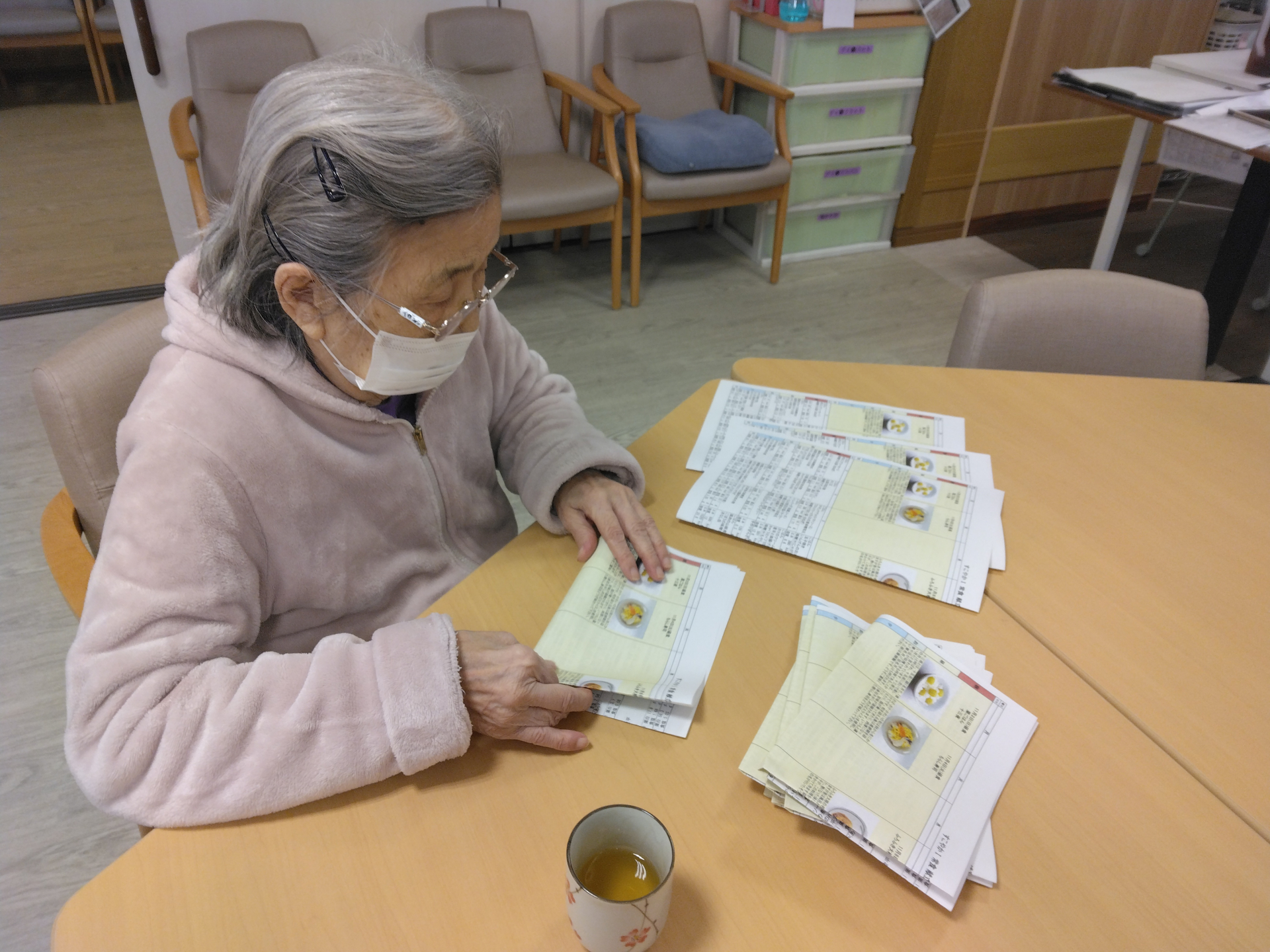 皆さまにお配りする11月の献立表を四つ折りにしていただきました!