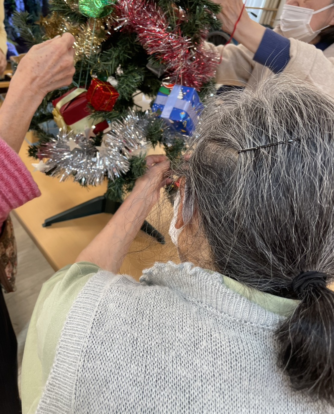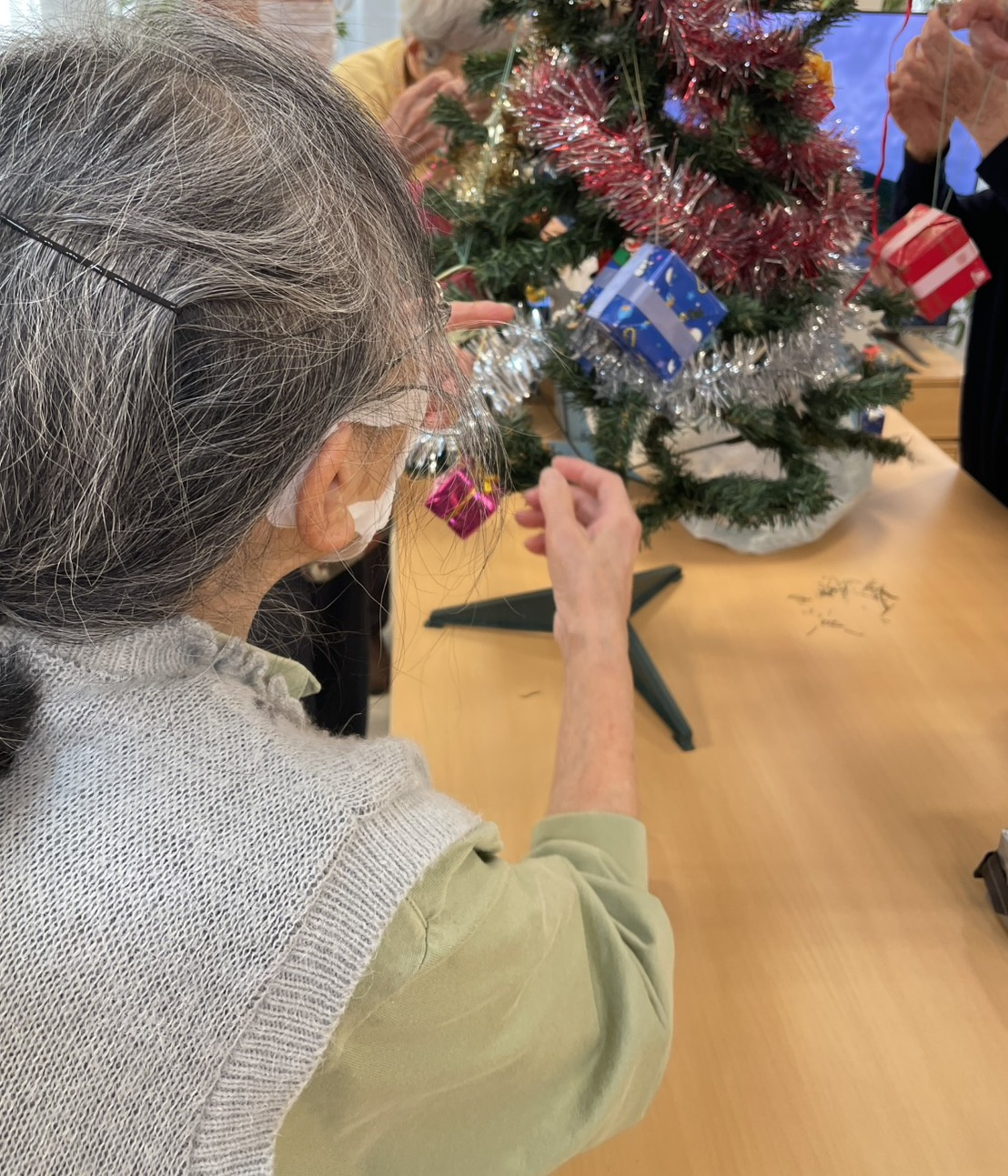 本日はレクとレクの合間の時間にクリスマスツリーの飾り付けを行いました!