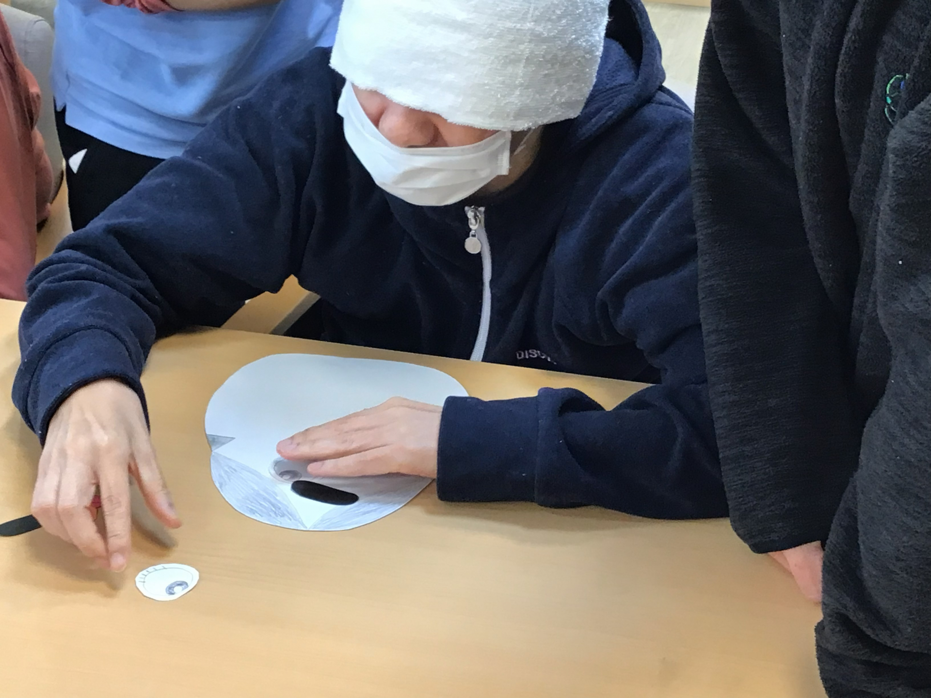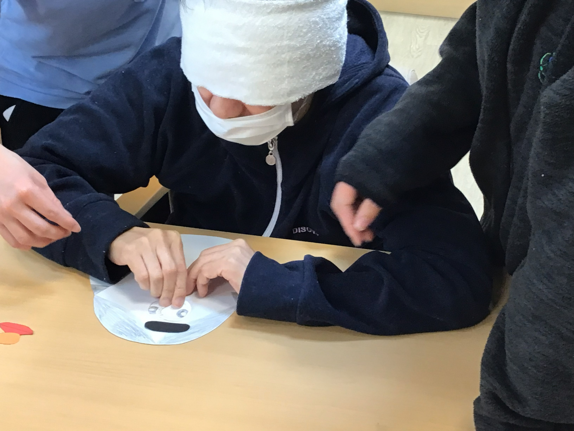 しっかりと目隠しをしたあと、今年の「福笑い」スタートで~す!