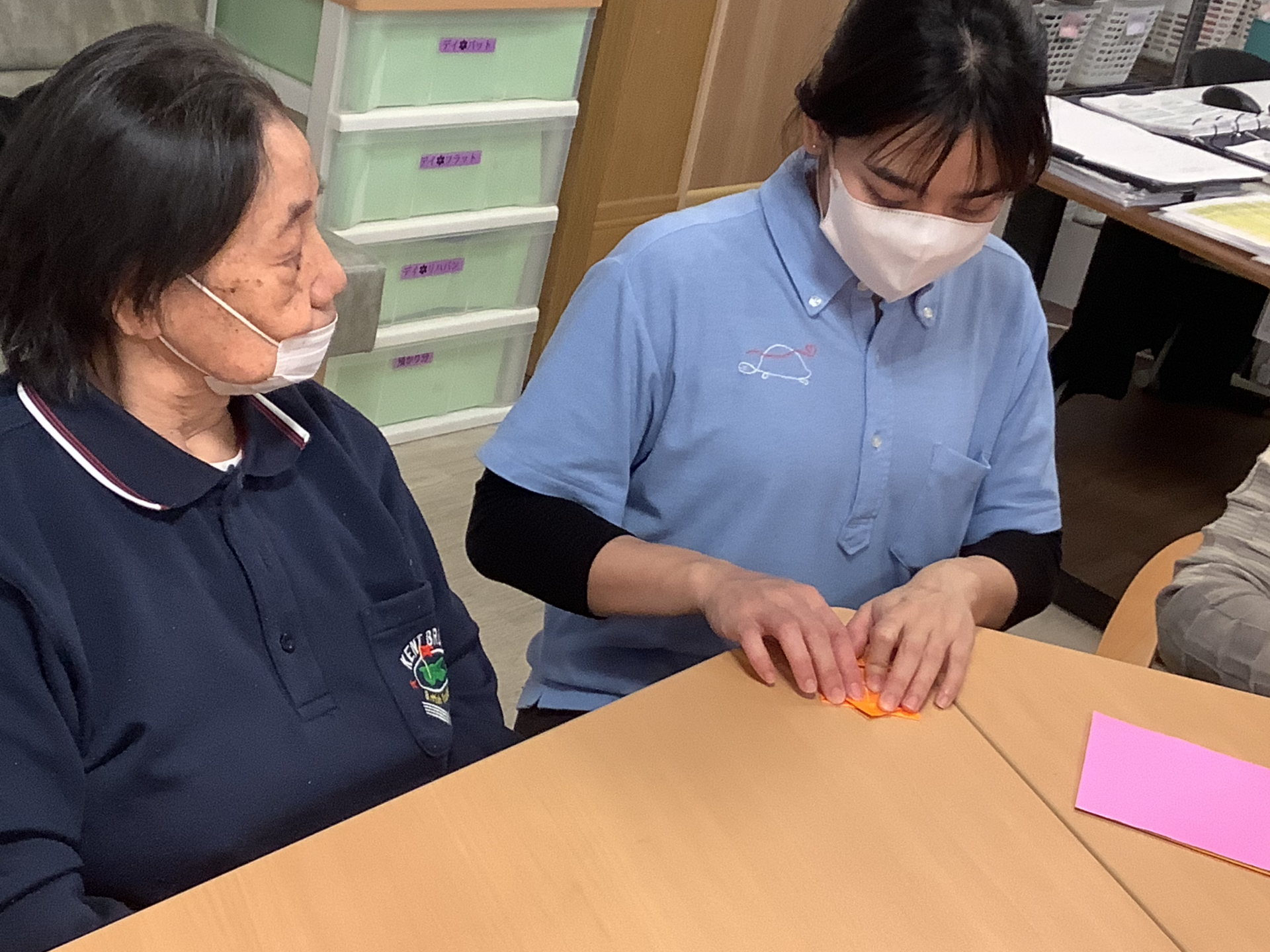 おやつ後は、皆さまでトランプを楽しまれたり、童謡を歌われたりして賑やかな雰囲気で過ごされました(^^♪こちらは、夕食を召し上がってお帰りになるお二方で、お食事が運ばれるまでの時間、折り紙で『鬼』を作っていただきました( ^∀^)