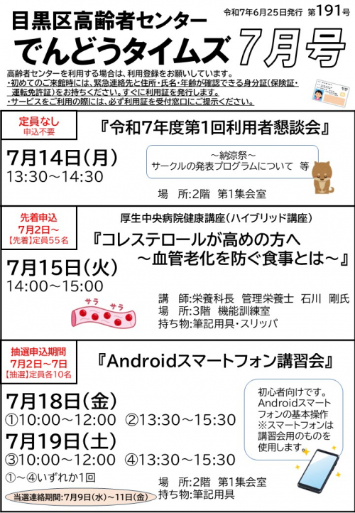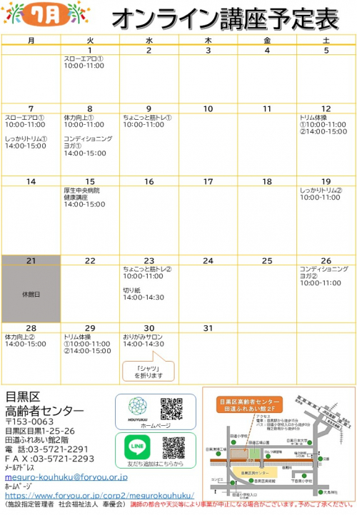 2025.10.31 【目黒区高齢者センター】音楽広場(2回目)を開催しました 活動報告 #目黒区高齢者センター #歌唱 #音楽広場 2025.10.29 【目黒区高齢者センター】ちょこっと筋トレを開催しました 活動報告 #体操 #介護予防 #運動 2025.10.28 【目黒区高齢者センター】厚生中央病院健康講座を開催しました 活動報告 #目黒区 #目黒区高齢者センター 2025.10.28 【目黒区高齢者センター】「Googleレンズを使ってみよう」講座を開催しました\(^o^)/ 活動報告 #目黒区高齢者センター #Googleレンズ機能を使ってみよう #Googleレンズ #スマホ講座 2025.10.28 【目黒区高齢者センター】おりがみサロンを開催しました 活動報告 #目黒区 #目黒区高齢者センター #楽しい #折り紙 2025.10.27 【目黒区高齢者センター】フォトスポットで楽しく撮影♪ 活動報告 #目黒区高齢者センター #タブレット講座 #ハロウィン #ハロウィンフォトスポット 2025.10.24 【目黒区高齢者センター】「魅せ色レッスン自分発見」講座を開催しました! 活動報告 #目黒区高齢者センター #パーソナルカラー #メイクレッスン #美容講座 2025.10.23 2025.11月オンライン講座予定表を公開いたします。 お知らせ 2025.10.23 2025.11月でんどうタイムズを公開いたします。 お知らせ 2025.10.22 【目黒区高齢者センター】「シニア向けパソコン基礎講座」を開催しました 活動報告 #目黒区高齢者センター #パソコン講座 #パソコン #エクセルで家計簿作成 2025.10.22 【目黒区高齢者センター】ハロウィンフォトスポット♪ 高齢者福祉センター #目黒区高齢者センター #ハロウィン #フォトスポット #コスプレ 2025.10.21 秋に感じる幸せ♪ 高齢者福祉センター #目黒区高齢者センター #金木犀 #金木犀の香り #秋の気配 #目黒川 2025.10.21 【目黒区高齢者センター】「体力向上教室」を開催しました! 活動報告 #目黒区高齢者センター #体力向上教室 2025.10.20 【目黒区高齢者センター】ちょこっと筋トレを開催しました 活動報告 #目黒区高齢者センター #体操 #運動 #健康づくり 2025.10.18 【目黒区高齢者センター】「脳トレタイム(2回目)」を開催しました 活動報告 #目黒区高齢者センター #クイズ #脳トレ #脳トレタイム 1 2 3 4 5 6 … 58
