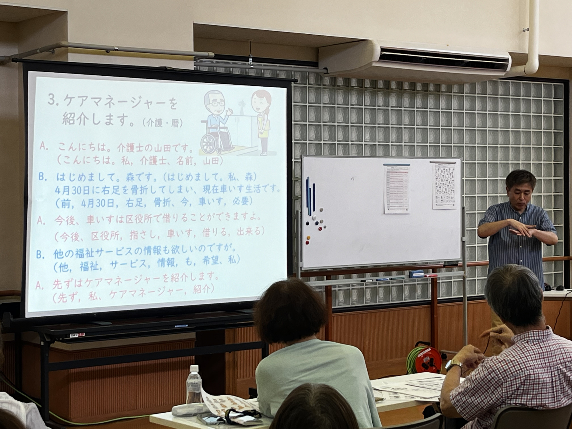高齢者にとって非常に身近で重要なテーマである「介護」。講座では、介護士とのやりとり、自分の体の状態を伝える表現、福祉サービスについての会話など、日常生活に役立つ実践的な手話を取り上げました。参加者の皆さんも熱心に取り組まれ、和やかな雰囲気の中で学びを深めることができました。