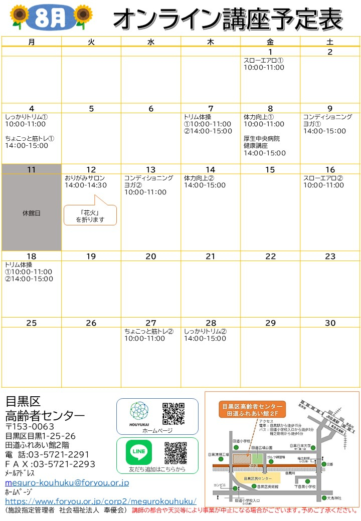 2025.07.23 お知らせ 2025.8月オンライン講座予定表を公開いたします。 Tweet シェアする 前の記事 2025.07.23 お知らせ 【目黒区高齢者センター】ちょこっと筋トレを開催しました 次の記事 2025.07.23 お知らせ 2025.8月でんどうタイムズを公開いたします。 一覧へ戻る