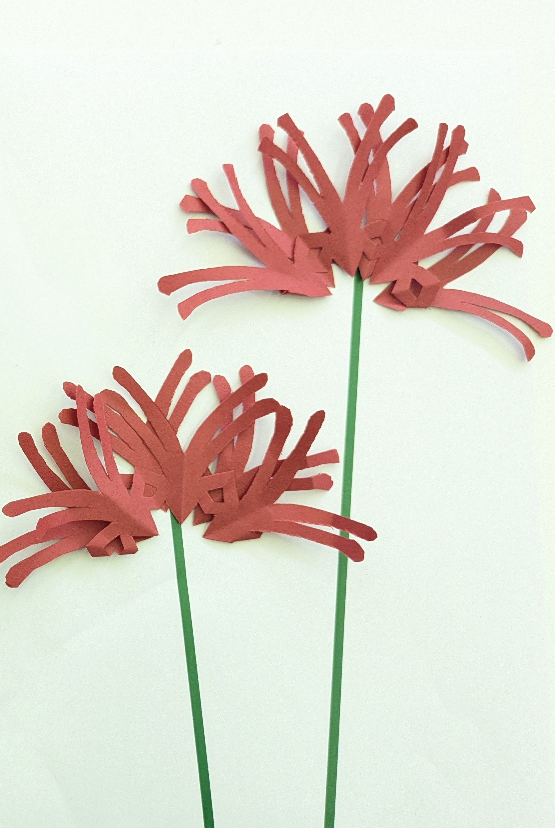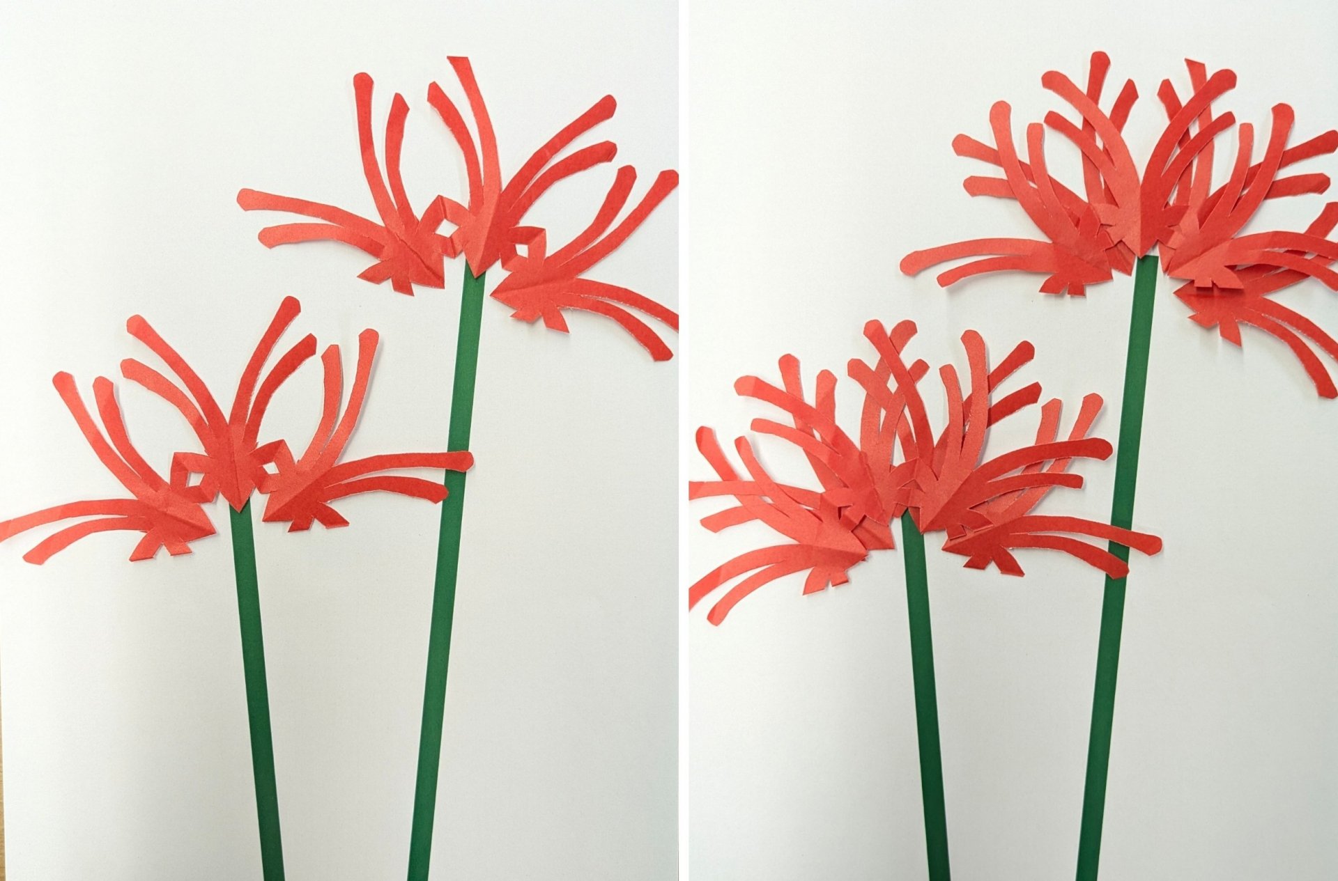 そこで、思い付きで両面カラーの色紙で彼岸花を作成した後、重なりがずれるように2つ折りにしてみました。