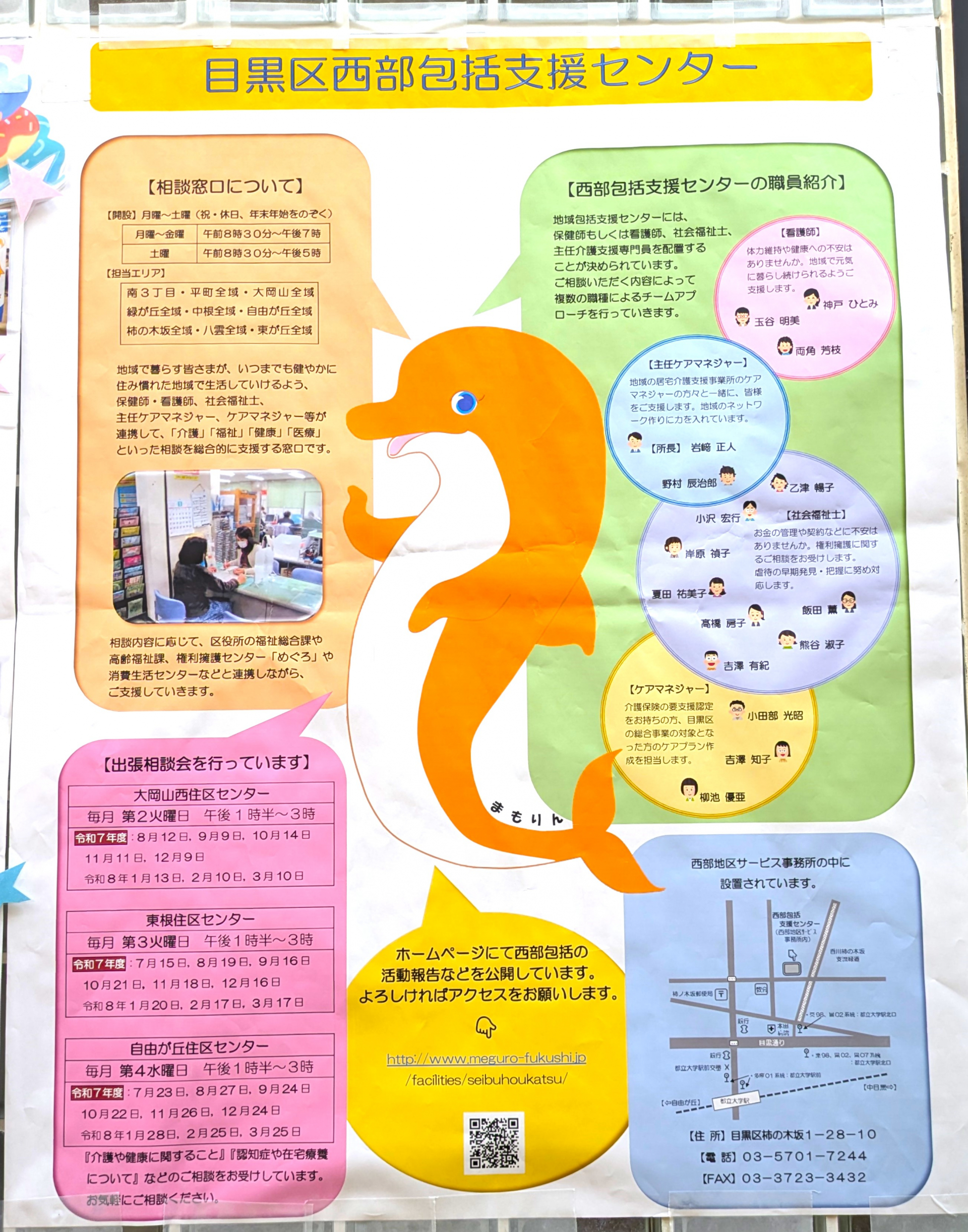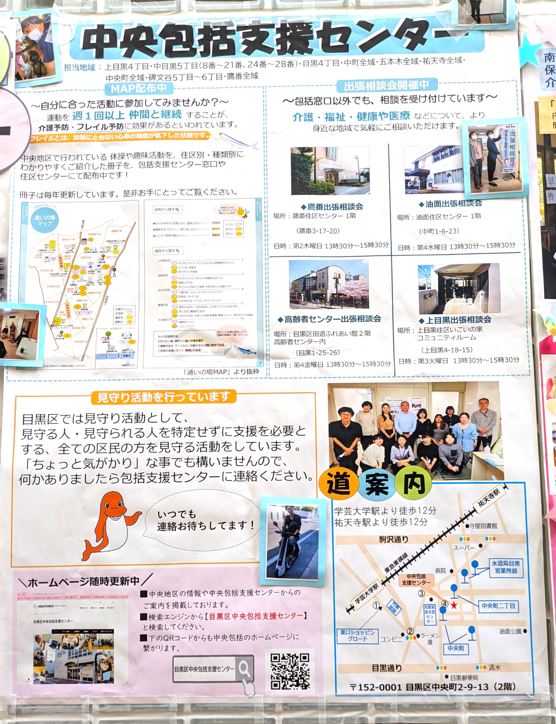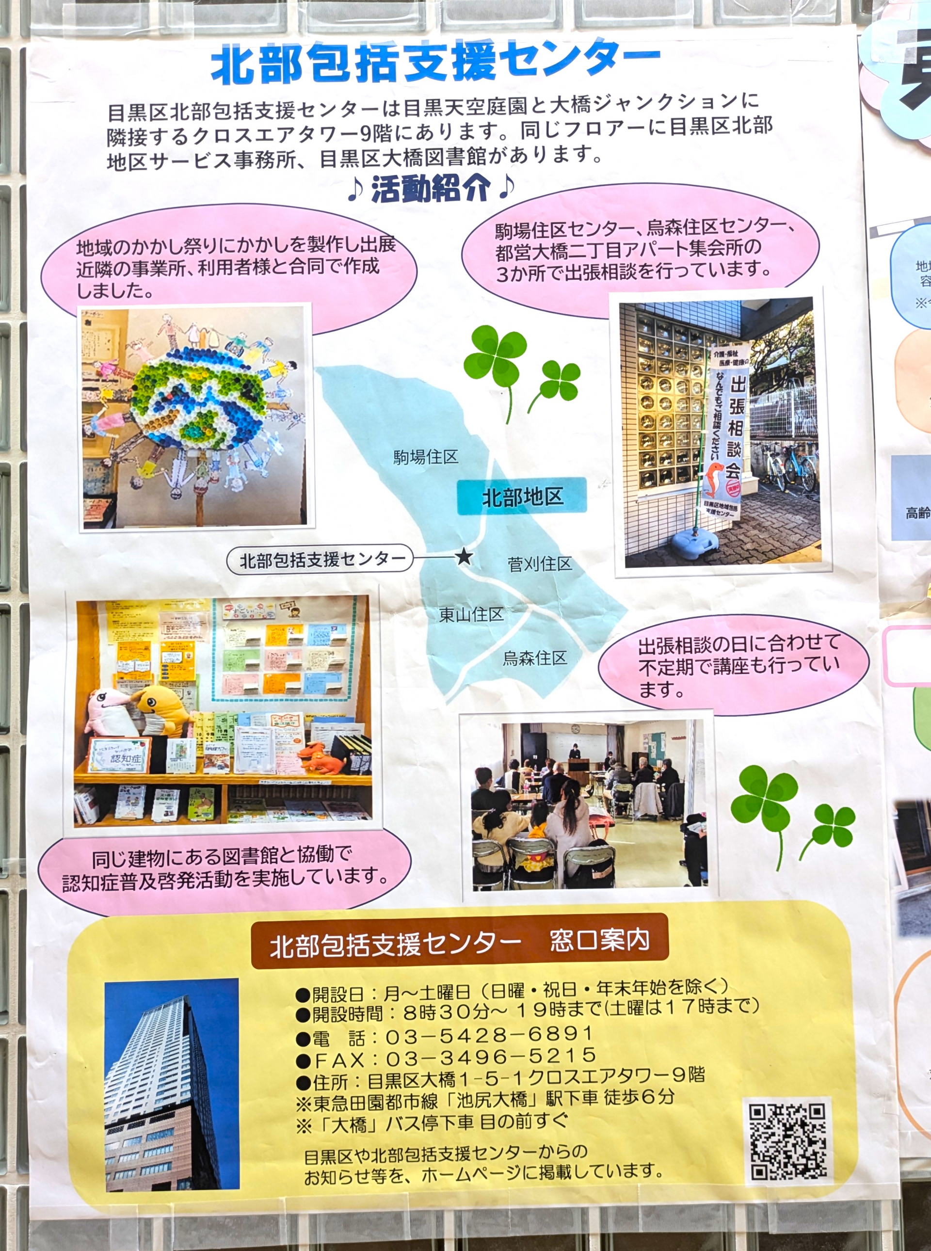今、センターでは目黒区各地域の包括支援センターのパネルポスターが2階集会室前の壁に大々的に貼ってあります。