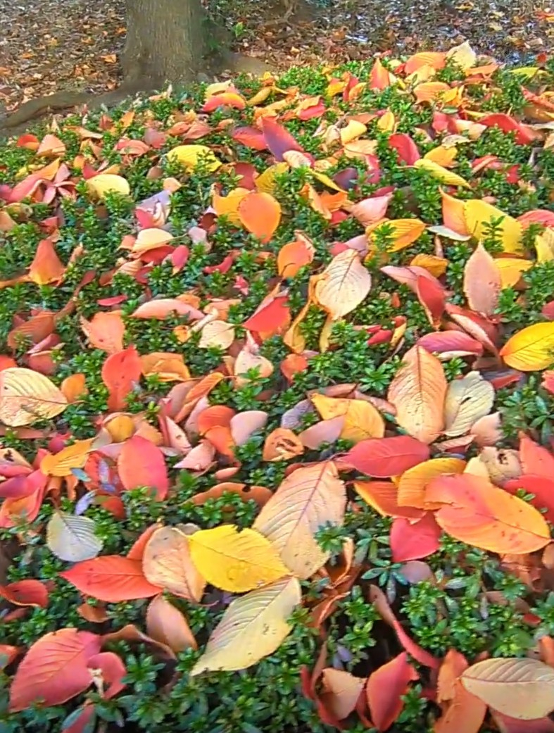 また、センターの近くにある公園「目黒清掃工場緩衝緑地」にも桜並木があり、その下の植え込みに落ちた紅葉の葉がとてもカラフルでまるでアート作品のようです。