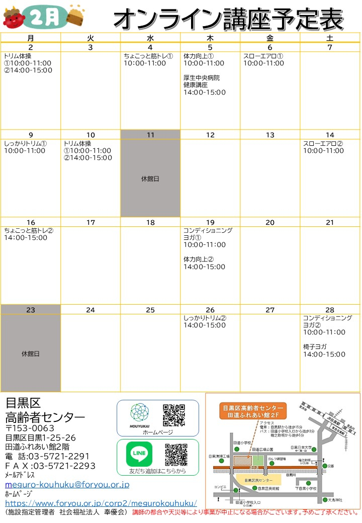 2026.01.23 お知らせ 2026.2月オンライン講座予定表を公開いたします。 Tweet シェアする 前の記事 2026.01.26 お知らせ 【目黒区高齢者センター】「座ってdance体験会」を開催しました 次の記事 2026.01.23 お知らせ 2026.2月でんどうタイムズを公開いたします。 一覧へ戻る