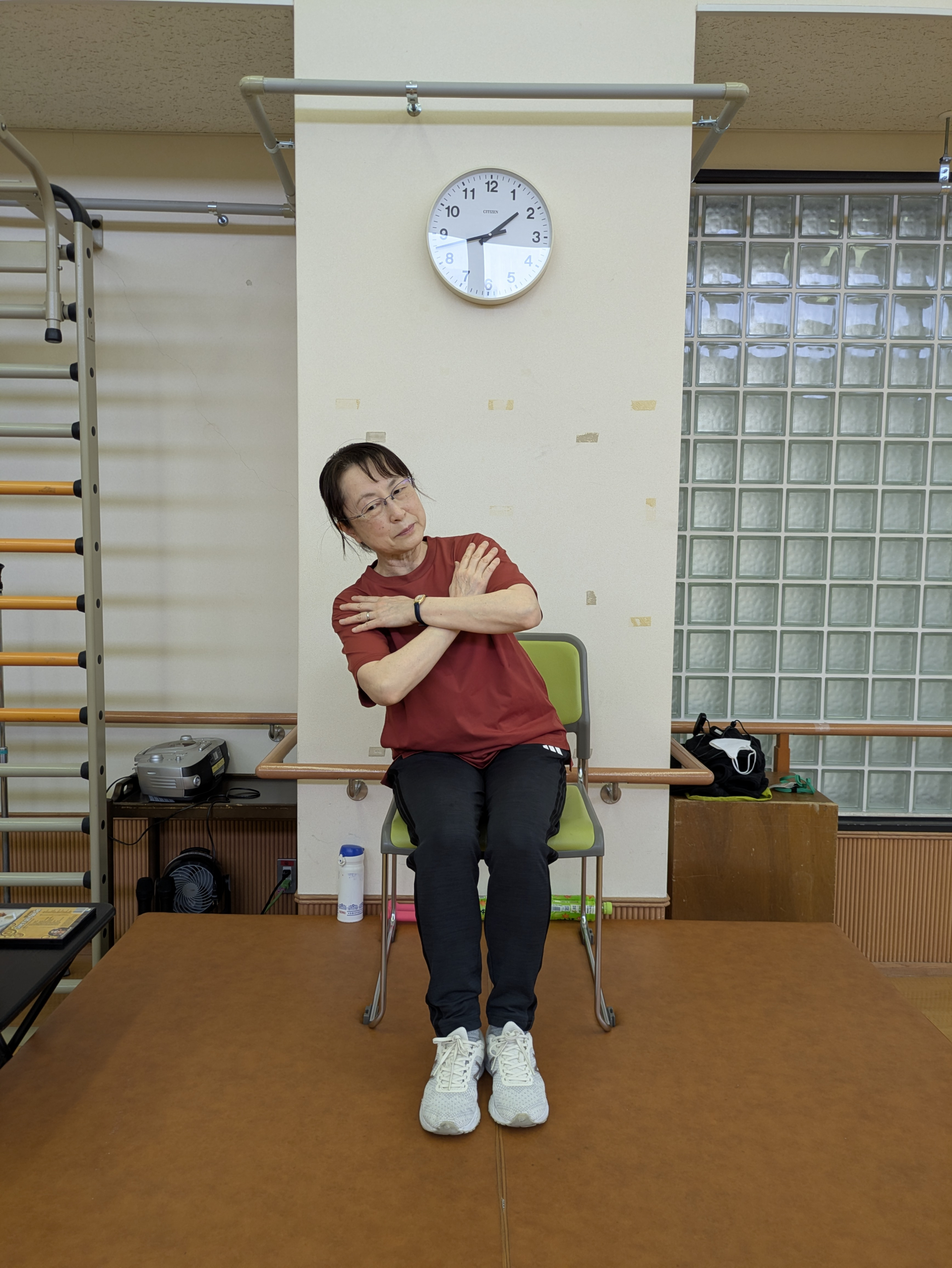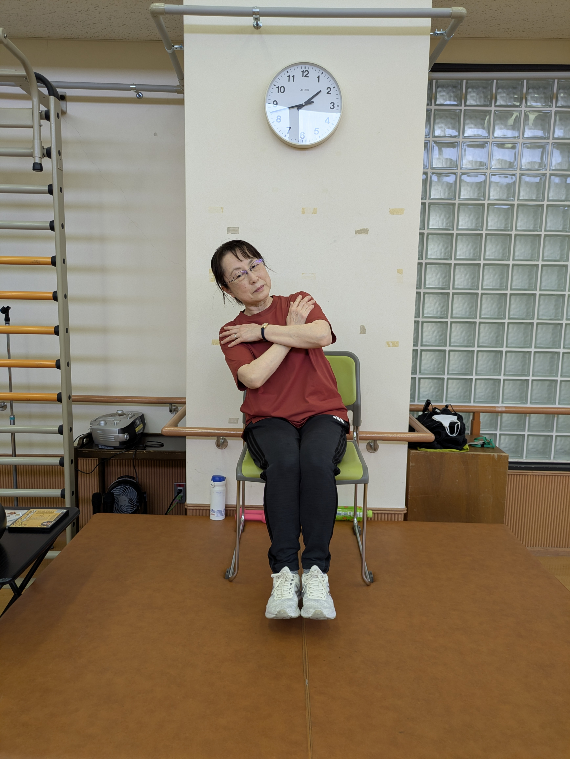 本日の「ちょこっと筋トレ」では座った状態で、バランスの運動を行いました。