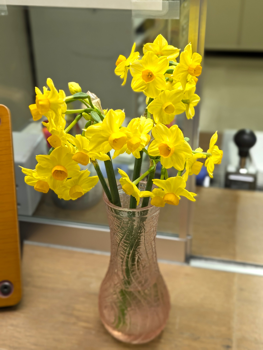 利用者の方から鮮やかな黄色に目を奪われる可憐な水仙をいただきました。受付が華やかです♪
