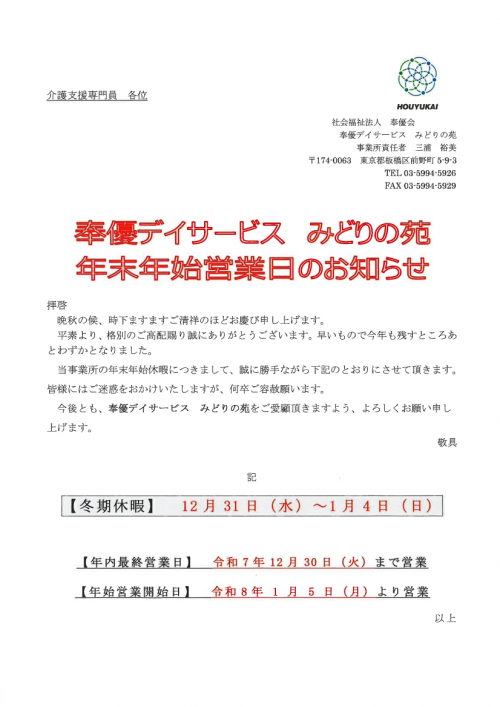 2025.12.10 【みどりデイ】ハンドベル演奏会②☆ 活動報告 #クリスマス #もうすぐクリスマス #奉優デイサービスみどりの苑 #ハンドベル # 奉優会 2025.12.10 【みどりデイ】12月ハンドベル演奏会☆ 活動報告 #ハンドベル #ハンドベル演奏会 #クリスマス #奉優デイサービスみどりの苑 # 奉優会 2025.12.09 【みどりデイ】みどり喫茶の日②☆ 活動報告 #喫茶の日 #奉優デイサービスみどりの苑 # 奉優会 # みどりデイ 2025.12.09 【みどりデイ】みどり喫茶の日①☆ 活動報告 #喫茶の日 # 奉優デイサービスみどりの苑 # 奉優会 2025.12.08 【みどりデイ】12月水彩絵手紙②☆ 活動報告 #水彩絵手紙 #クリスマス #もうすぐクリスマス #奉優会 #奉優デイサービスみどりの苑 2025.12.08 【みどりデイ】12月水彩絵手紙①☆ 事務局 #水彩絵手紙 #クリスマス #もうすぐクリスマス #奉優会 # 奉優デイサービスみどりの苑 2025.12.06 【みどりデイ】手工芸クリスマスリース作り②☆ 活動報告 #クリスマスリース #手工芸 #奉優会 # 奉優デイサービスみどりの苑 2025.12.06 【みどりデイ】手工芸クリスマスリース作り①☆ 活動報告 #クリスマスリース作り #奉優デイサービスみどりの苑 #手工芸 # 奉優会 2025.12.06 【みどりデイ】クリスマスツリーを飾りました☆ 活動報告 #クリスマスツリー #奉優デイサービスみどりの苑 # 奉優会 2025.12.05 【みどりデイ】♦みどり通信11月号のお知らせ お知らせ #奉優デイサービスみどりの苑 #奉優会 #みどり通信 #11月 2025.12.05 【みどりデイ】中西先生の立ちましょビクス②☆ 活動報告 #立ましょビクス #中西先生 #奉優デイサービスみどりの苑 # 奉優会 2025.12.04 【みどりデイ】♦年末年始のお知らせ お知らせ # 奉優デイサービスみどりの苑 # 奉優会 #お知らせ #年末年始のお知らせ 2025.12.04 【みどりデイ】日常♪書道と貼り絵☆ 活動報告 #日常 #書道 #貼り絵 #奉優デイサービスみどりの苑 # 奉優会 2025.12.04 【みどりデイ】中西先生の立ちましょビクス☆ 活動報告 #淑徳大学 #中西先生 #立ちましょビクス #奉優会 # 奉優デイサービスみどりの苑 2025.12.03 【みどりデイ】クリスマス装飾しました~☆ 活動報告 #クリスマス飾り #奉優会 #奉優デイサービスみどりの苑 1 2 3 … 46