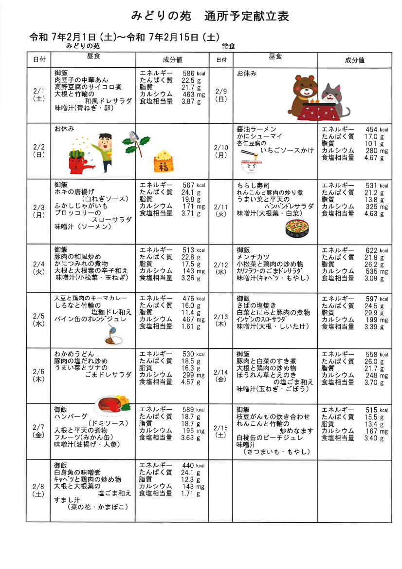 2025.01.27 お知らせ 【みどりデイ】2月前半献立表♪ Tweet シェアする 皆さまこんにちは! 奉優デイサービスみどりの苑です! 2月前半の献立表が出来上がりました♪ 2月もしっかり食べて栄養とって 元気に過ごしていきましょう!! みどりデイ 三浦 #奉優デイサービスみどりの苑 #奉優会 #2月 #献立表 前の記事 2025.01.28 お知らせ 【みどりデイ】1月号☆みどり通信 次の記事 2025.01.27 お知らせ 【みどりデイ】2月☆月間予定表♪ 一覧へ戻る