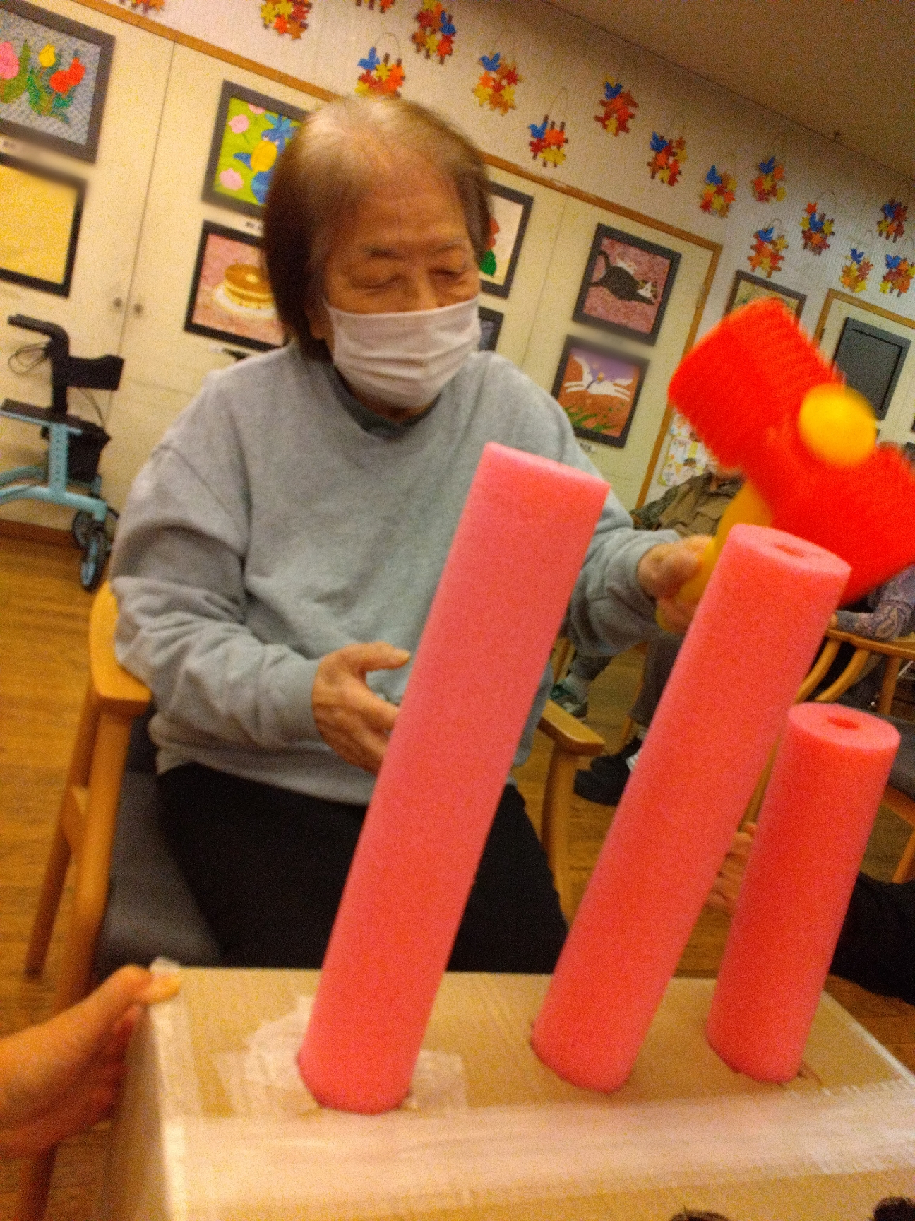 ポールをピコピコハンマーで叩いて早く段ボールの中に入れた