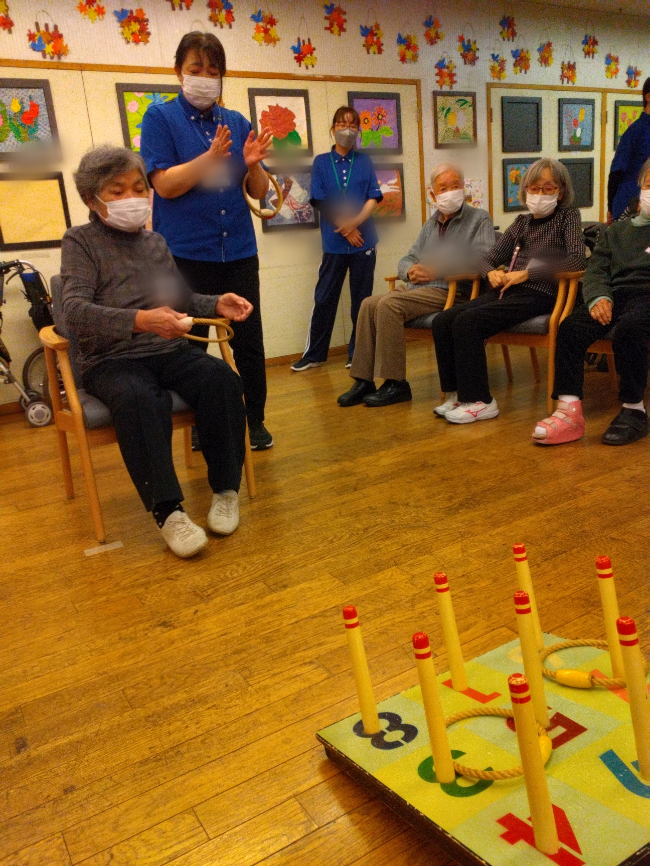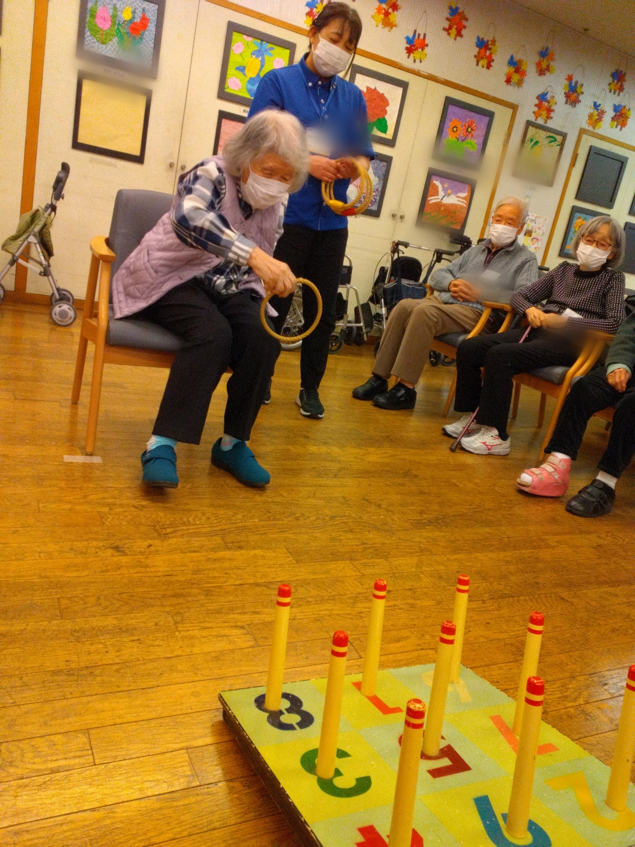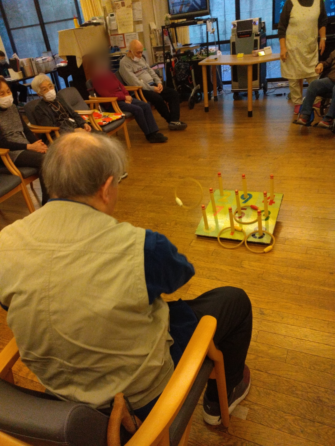 勢いつけて「そーれ!!」 連続で輪投げが入ったときは歓声が