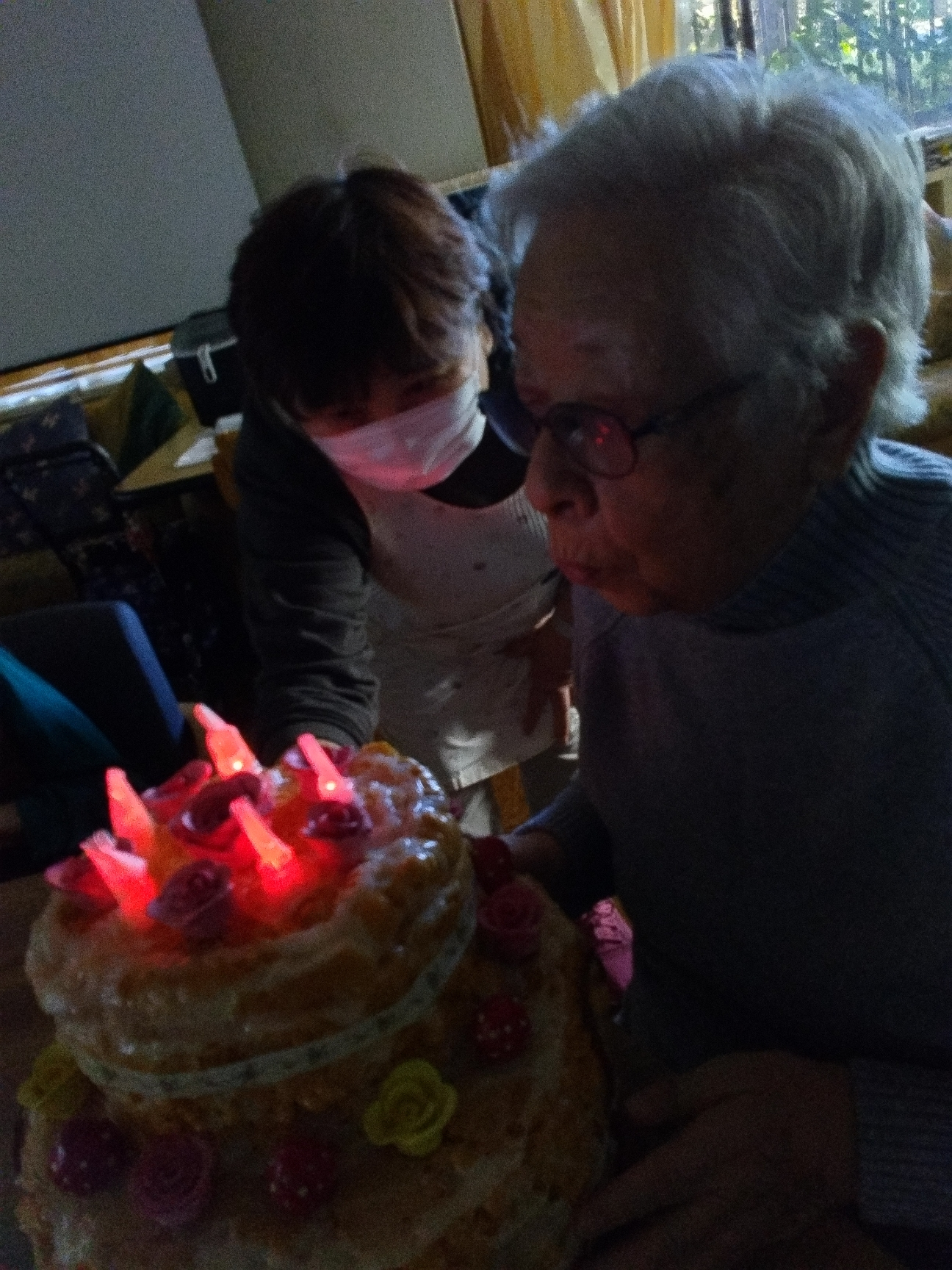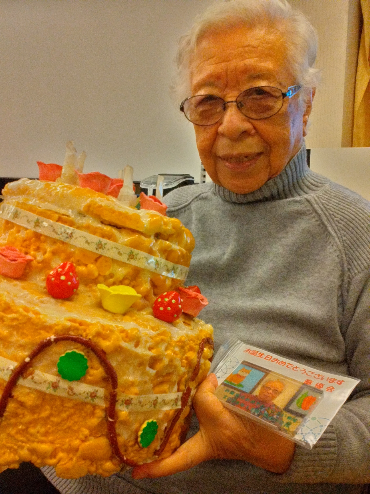 お誕生日月の方たちにはみどりの長寿誕生日ケーキのろうそくを