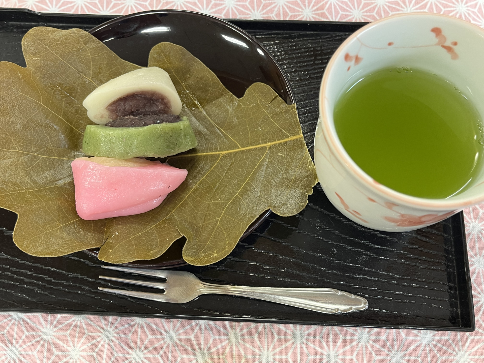 本日のお茶菓子は、子供の日にちなんで「柏餅」となっております。