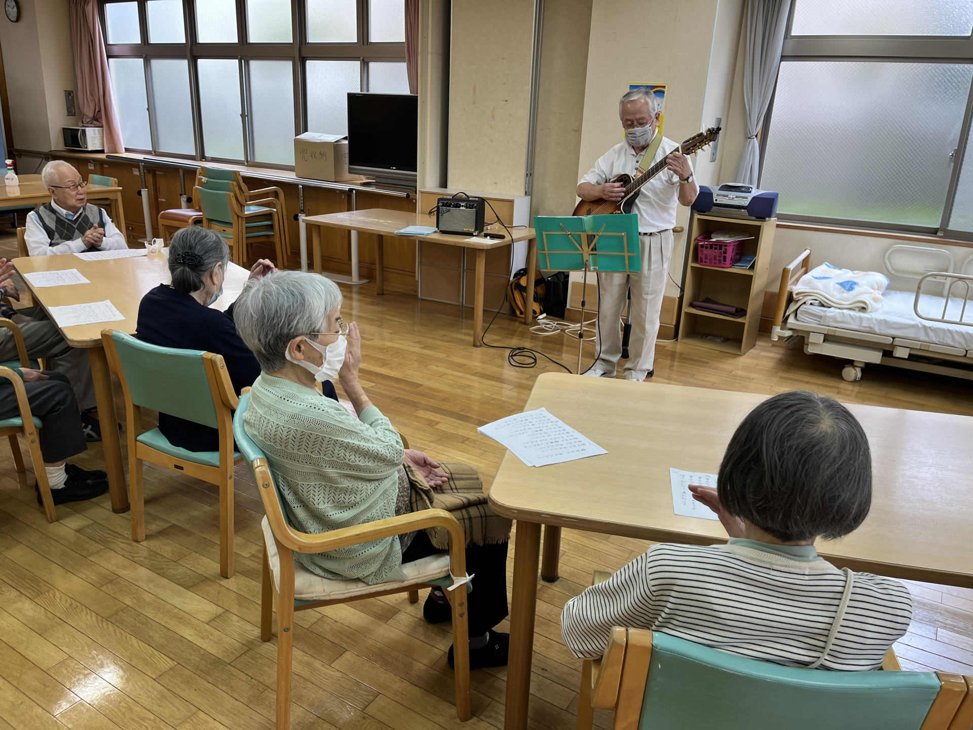「幸せなら手を叩こう」をギターと歌に合わせて体を動かしたり、「北の宿」などの懐かしい歌をギターの音色に合わせて歌を歌われ過ごされました。