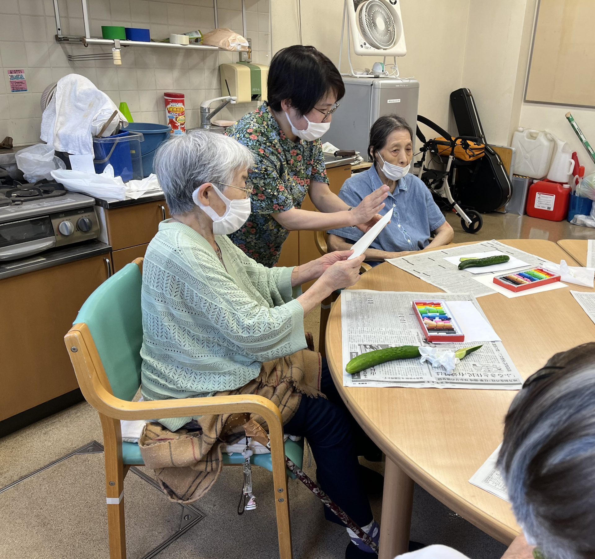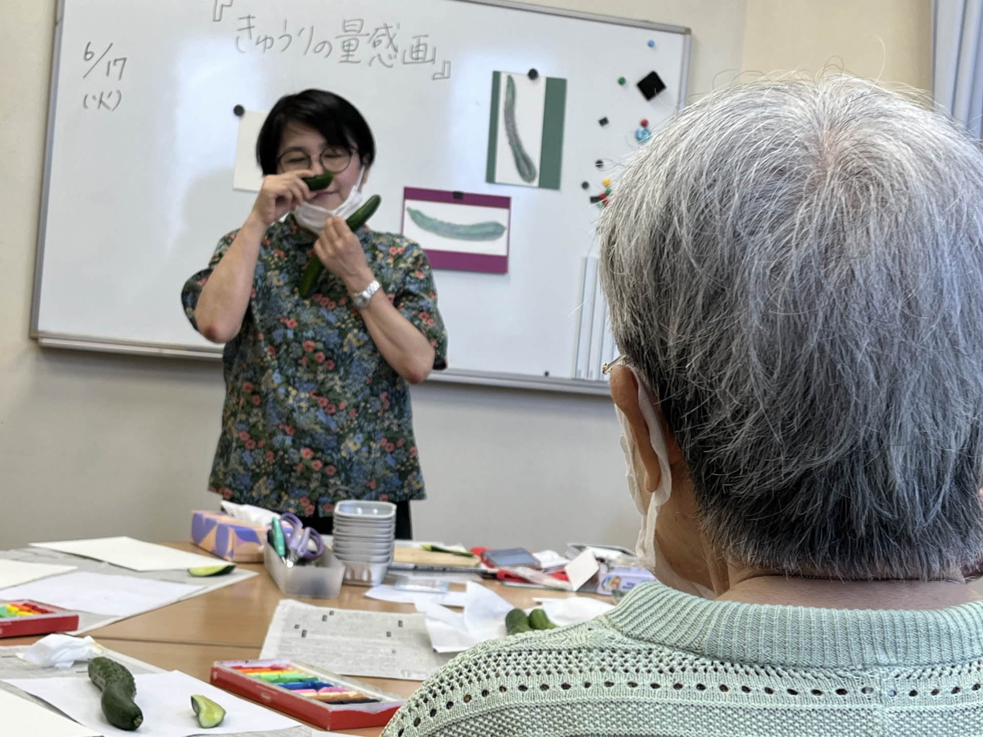 2025.06.17 活動報告 臨床美術 Tweet シェアする 午後から臨床美術を開催! 今月の題材は「きゅうり」となっております。 先生の説明を受けながら取り組まれておりました! 最後には立派なきゅうりとなっておりました! 前の記事 2025.06.21 活動報告 矢部職員~ホームページ開始! 次の記事 2025.06.11 活動報告 二名の新しいスタッフが入りました! 一覧へ戻る