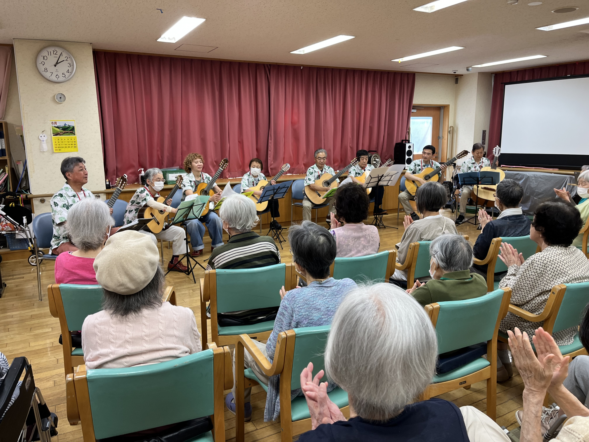 「上を向いて歩こう」・「学生時代」などギターの音色に合わせて歌ったり