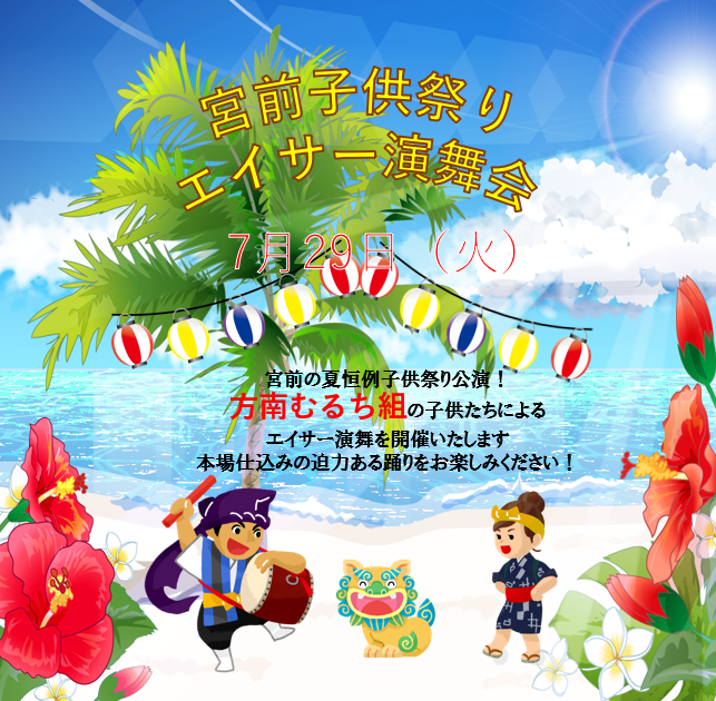 7/29「方南むるち組」の子供たちによるエイサー演舞を開催いたします。