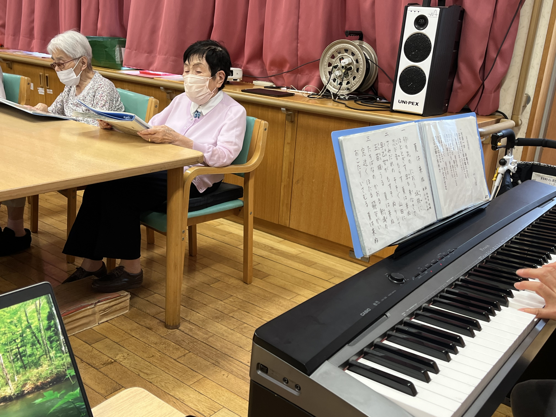 ピアノ歌会では「春は来ぬ」や「ふるさと」などの曲をピアノの音と共に歌を歌われました。