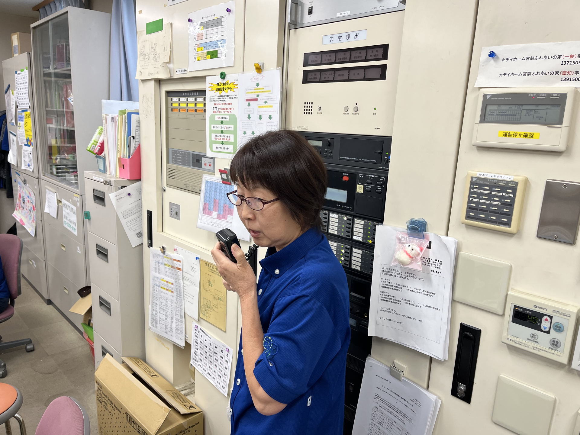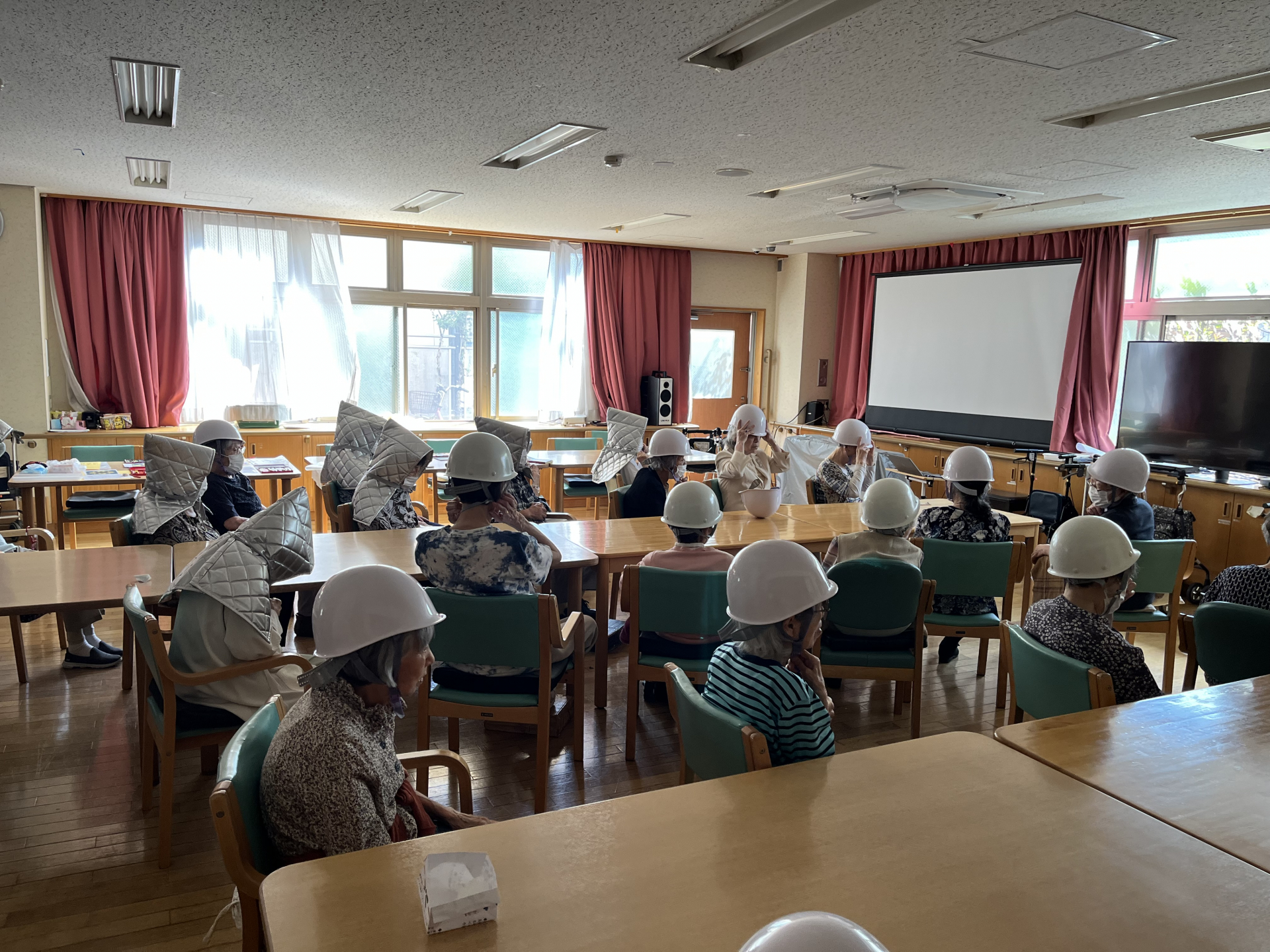 今回は「震度5の地震」を想定。ご利用者様にもご協力いただきヘルメット・防災頭巾をかぶっていただきました。