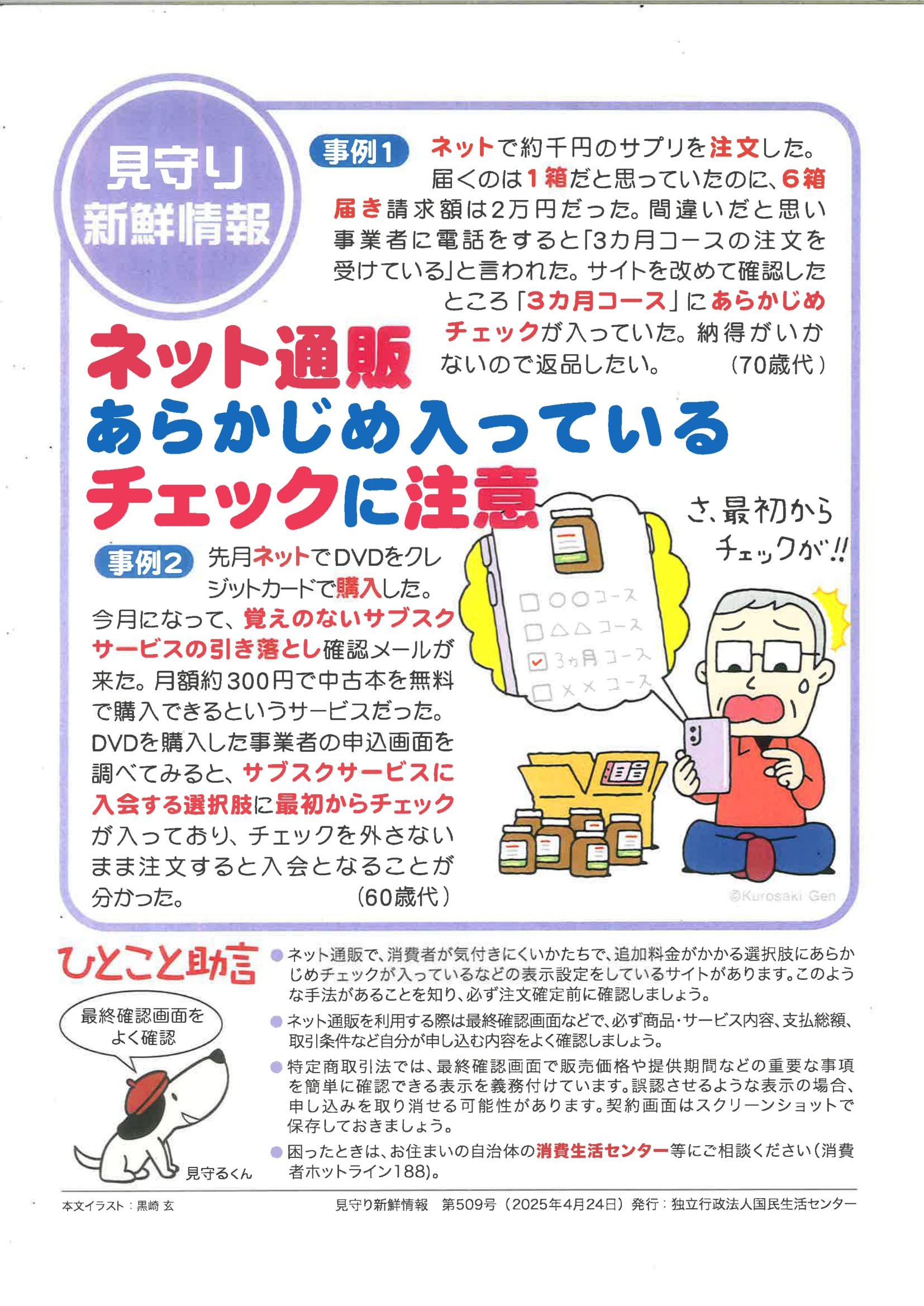 2025.04.24 ニュース 見守り新鮮情報 Tweet シェアする 独立行政法人国民生活センターより、「見守り新鮮情報 第509号」が発行されました。 ネット通販 あらかじめ入っているチェックに注意 生活相談員 S 前の記事 2025.04.28 ニュース 「ももガーデン」の様子 次の記事 2025.04.23 ニュース 明日は、ヘアカットサービス「宮前理髪店」を開催します。 一覧へ戻る