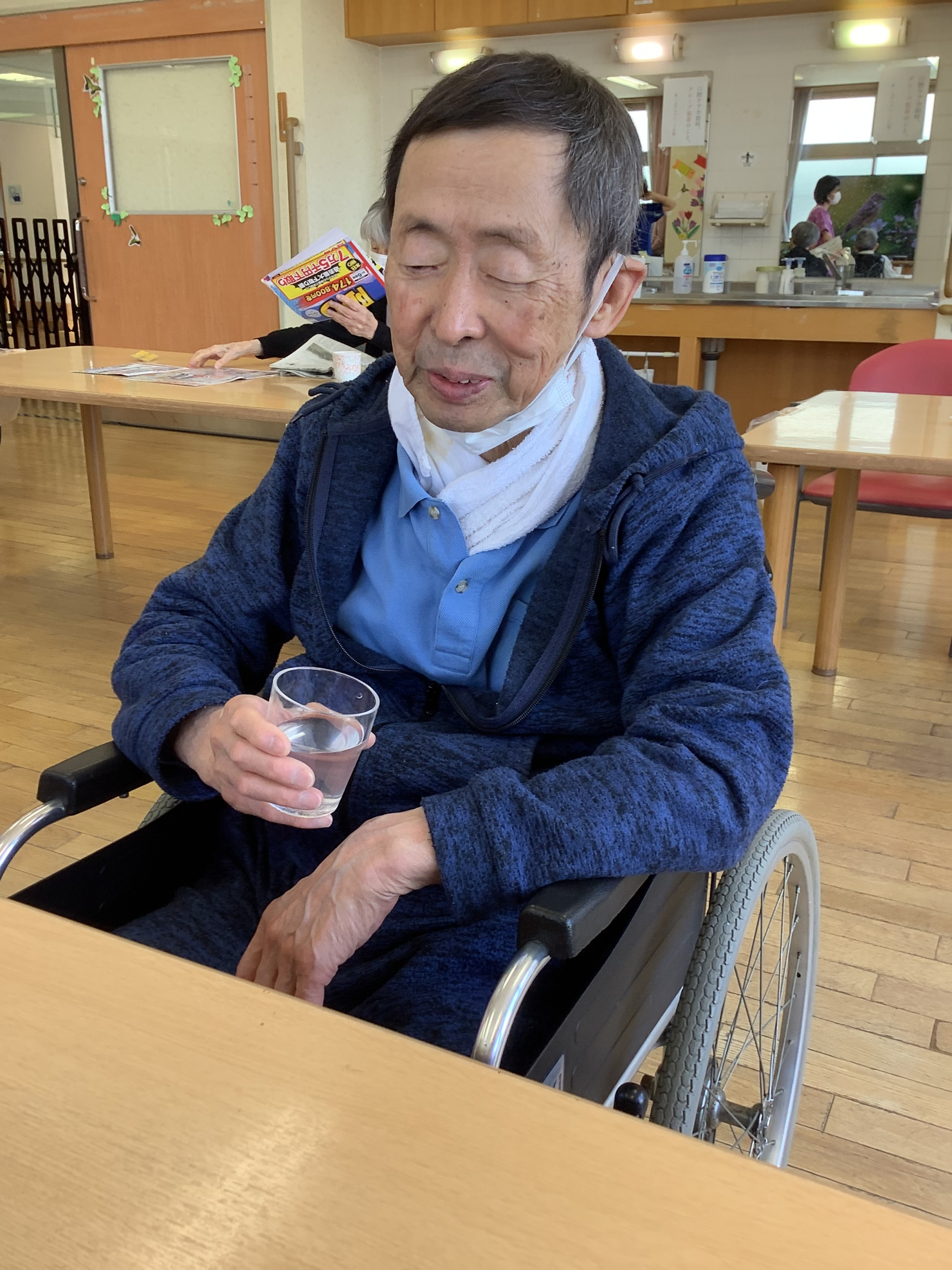 C様、朝の入浴を済ませて、スポーツドリンクを飲みながらゆっくりとされてます。