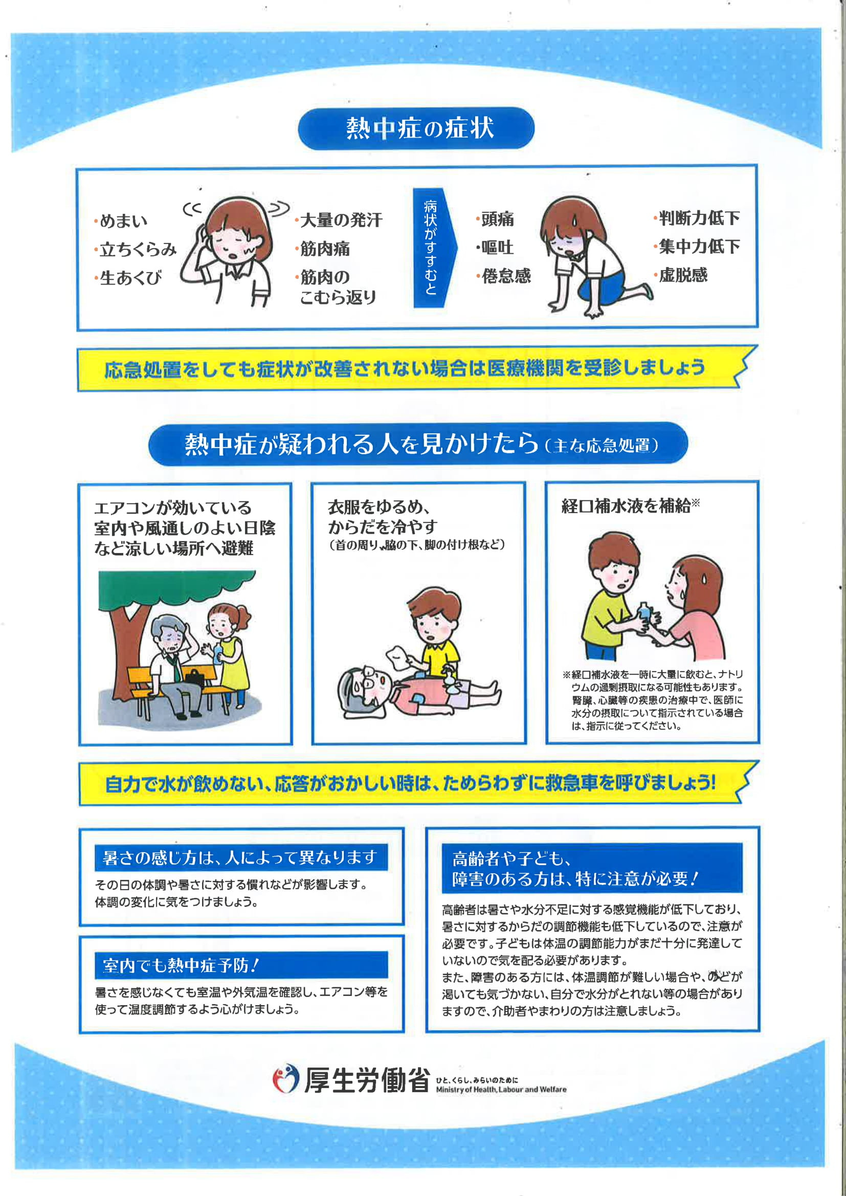 2025.06.20 ニュース 熱中症予防のために Tweet シェアする 厚生労働省より、「熱中症予防のために」のポスターが届きましたのでご紹介いたします。 厚生労働省ホームページ:heat stroke flyer_OK ol 1225 生活相談員 S 前の記事 2025.06.20 ニュース 熱中症に気を付けよう! 次の記事 2025.06.20 ニュース 見守り新鮮情報 一覧へ戻る