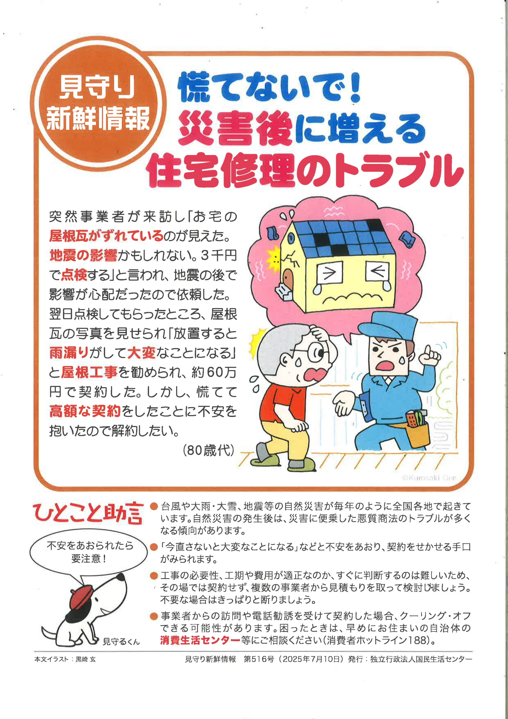 2025.07.11 ニュース 見守り新鮮情報 Tweet シェアする 独立行政法人国民生活センターより、「見守り新鮮情報 第516号」が発行されました。 慌てないで!災害後に増える住宅修理のトラブル 生活相談員 S 前の記事 2025.07.11 ニュース 夏野菜の収穫 次の記事 2025.07.10 ニュース 夏野菜の収穫 一覧へ戻る
