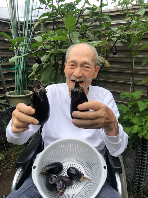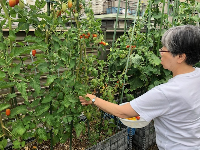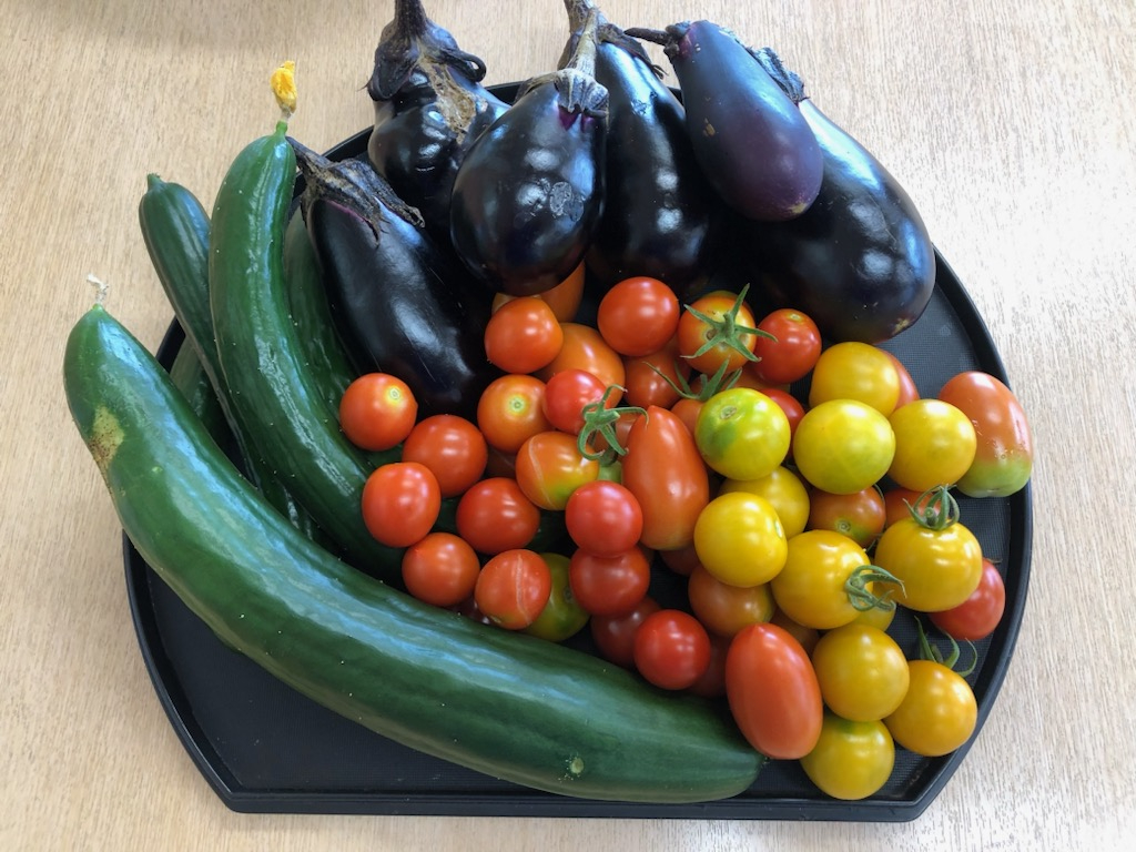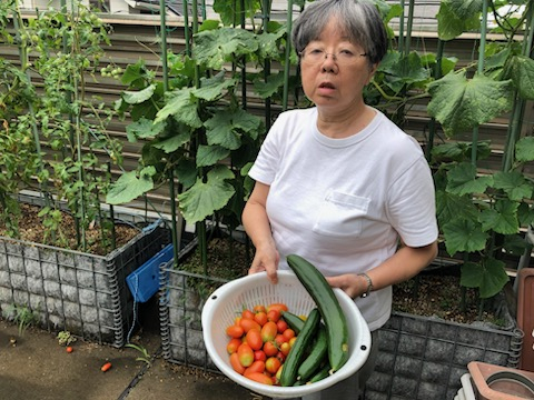 きょうの夏野菜の収穫は、雨の上がった午後、おふたりの方にお願いしました。