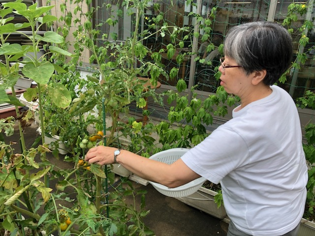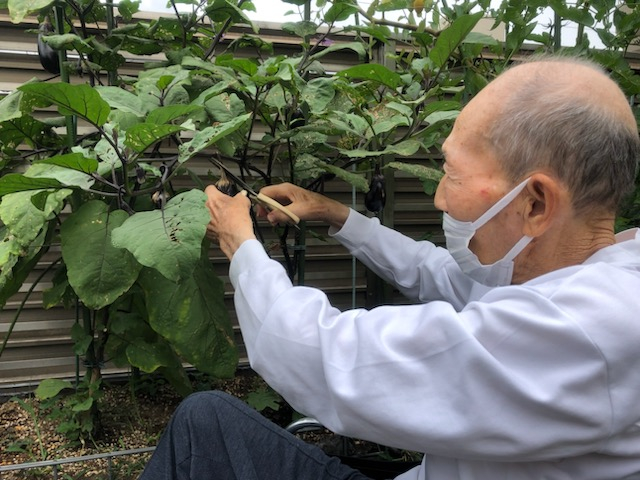 きょうの夏野菜の収穫は、雨の上がった午後、おふたりの方にお願いしました。