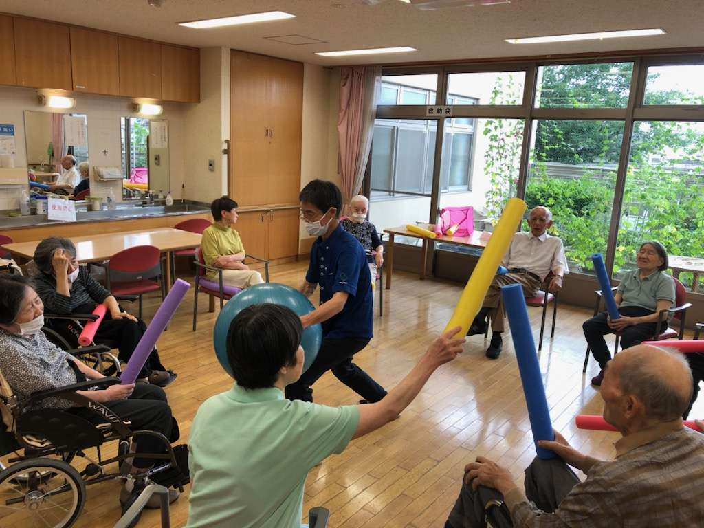 2025.07.16 活動報告 フロアの様子!実況中継!! Tweet シェアする ただいまフロアでは、「カラーポール」を使った、体操とゲームを行っています。 ご覧の画像は、ポールで大きなボールをリズミカルに叩くゲームをしているところです。 生活相談員 S 前の記事 2025.07.16 活動報告 個別対応~テーブルゲーム~ 次の記事 2025.07.16 活動報告 フロアの様子!実況中継!! 一覧へ戻る