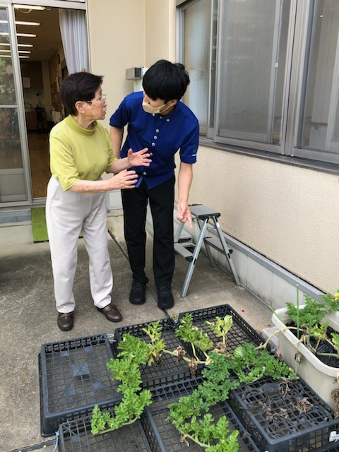 職員と一緒に、「ももガーデン(認知デイのバルコニー)」を散策中のA様。