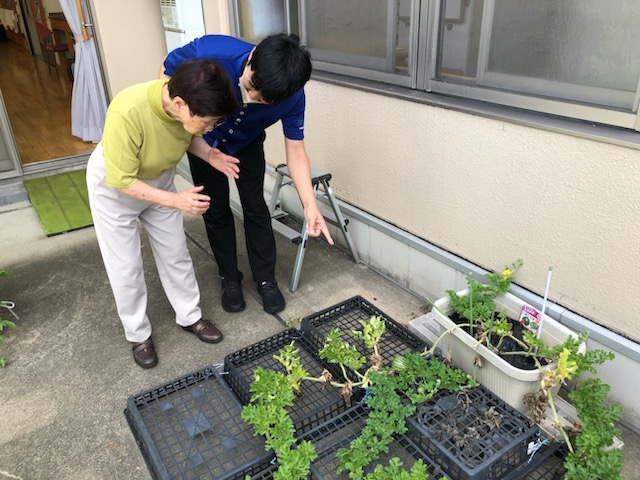 職員と一緒に、「ももガーデン(認知デイのバルコニー)」を散策中のA様。
