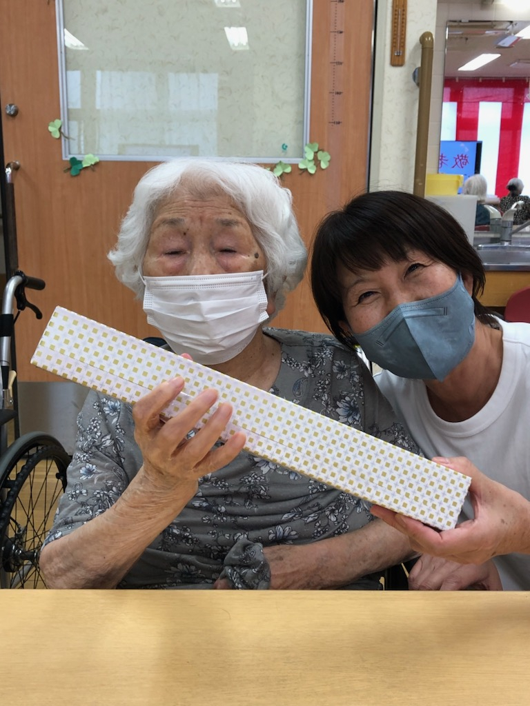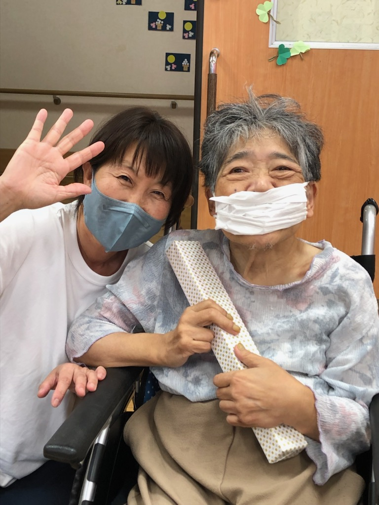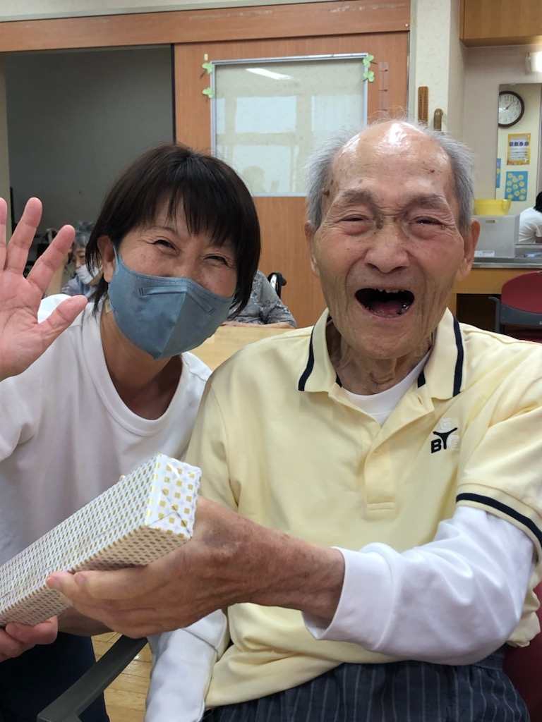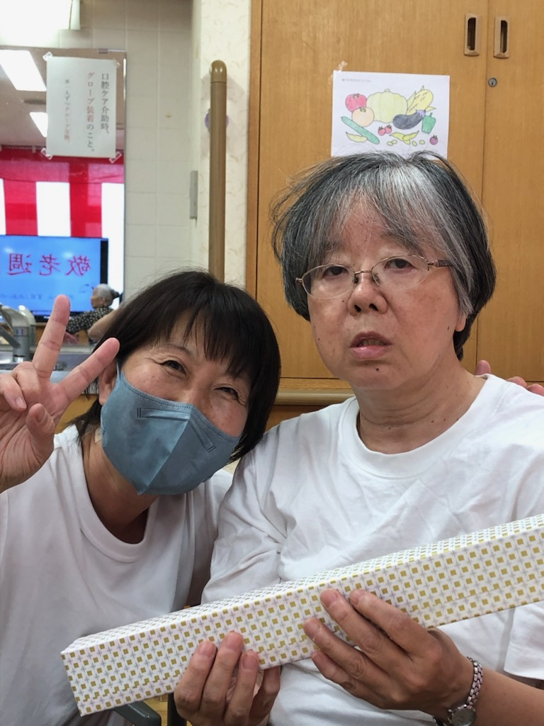 午後、おやつの時間の前に、事業所責任者より「敬老の日の記念品」の贈呈を行いました。