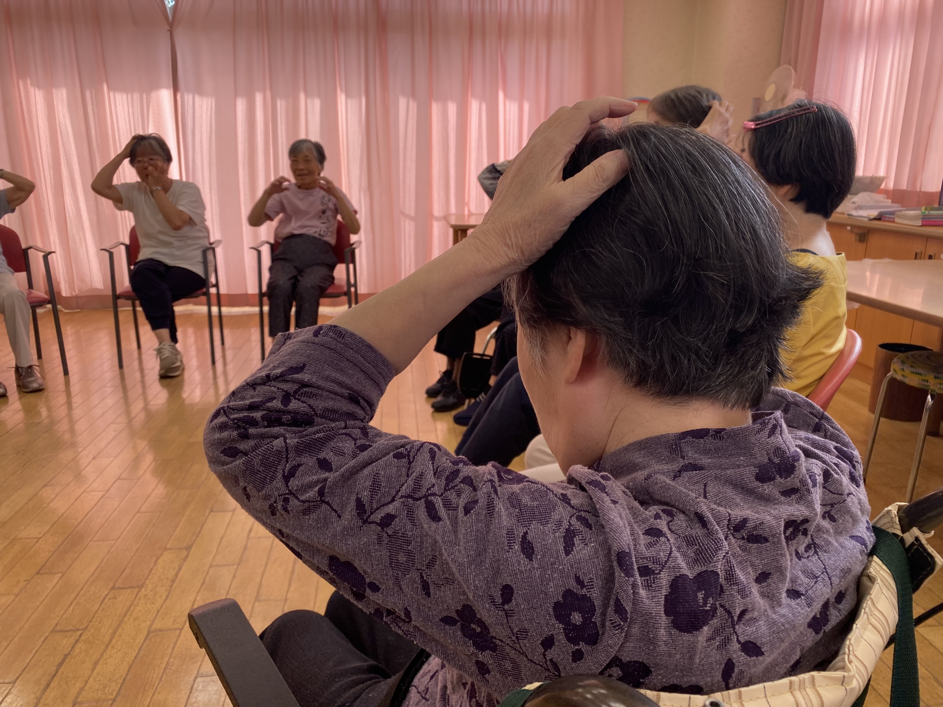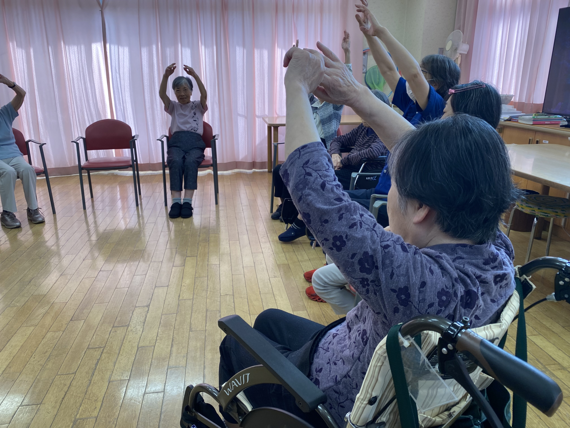 本日の午後は、皆様で輪になり、座ったままできる体操プログラムを実地しました。