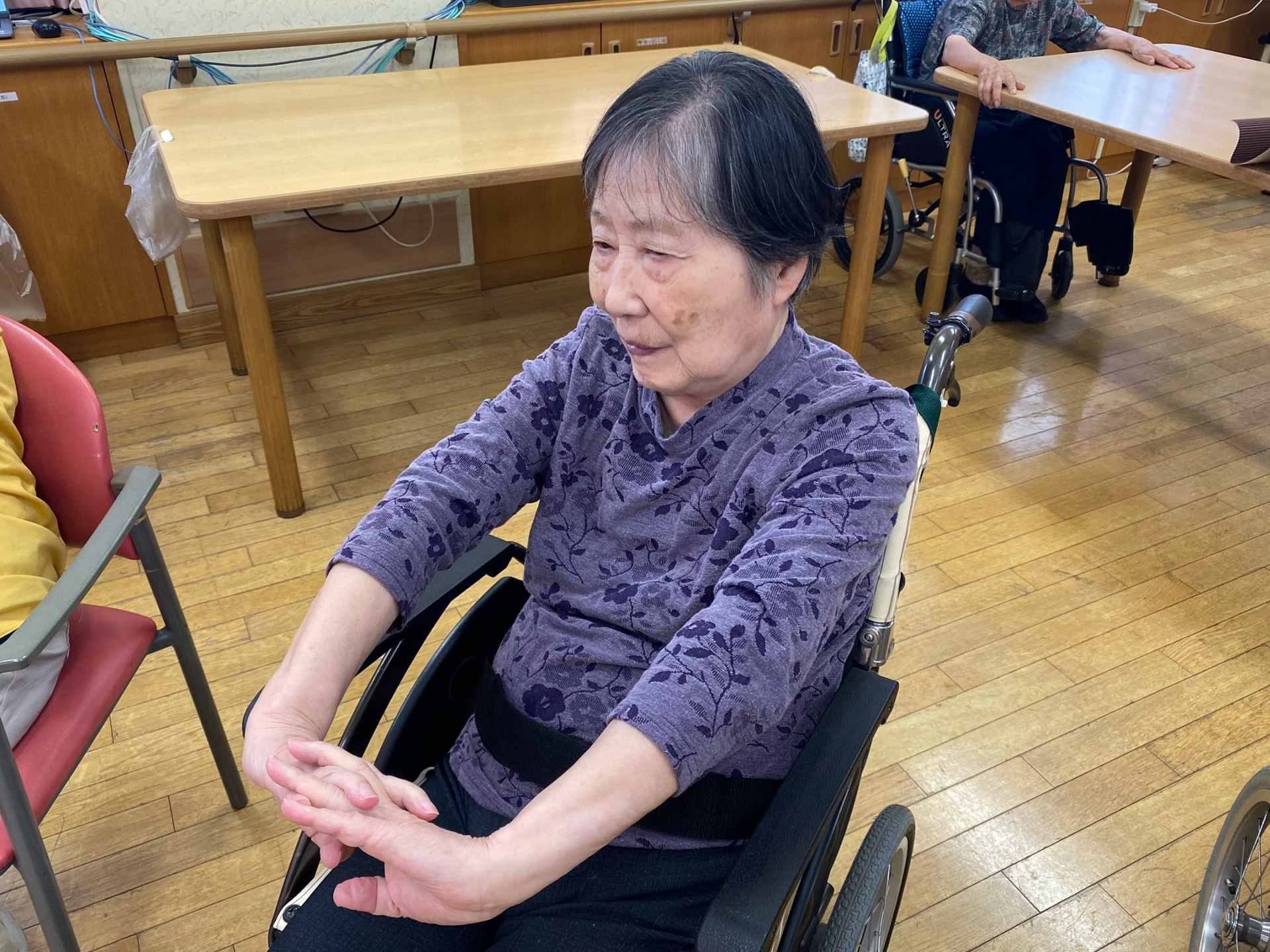 本日の午後は、皆様で輪になり、座ったままできる体操プログラムを実地しました。