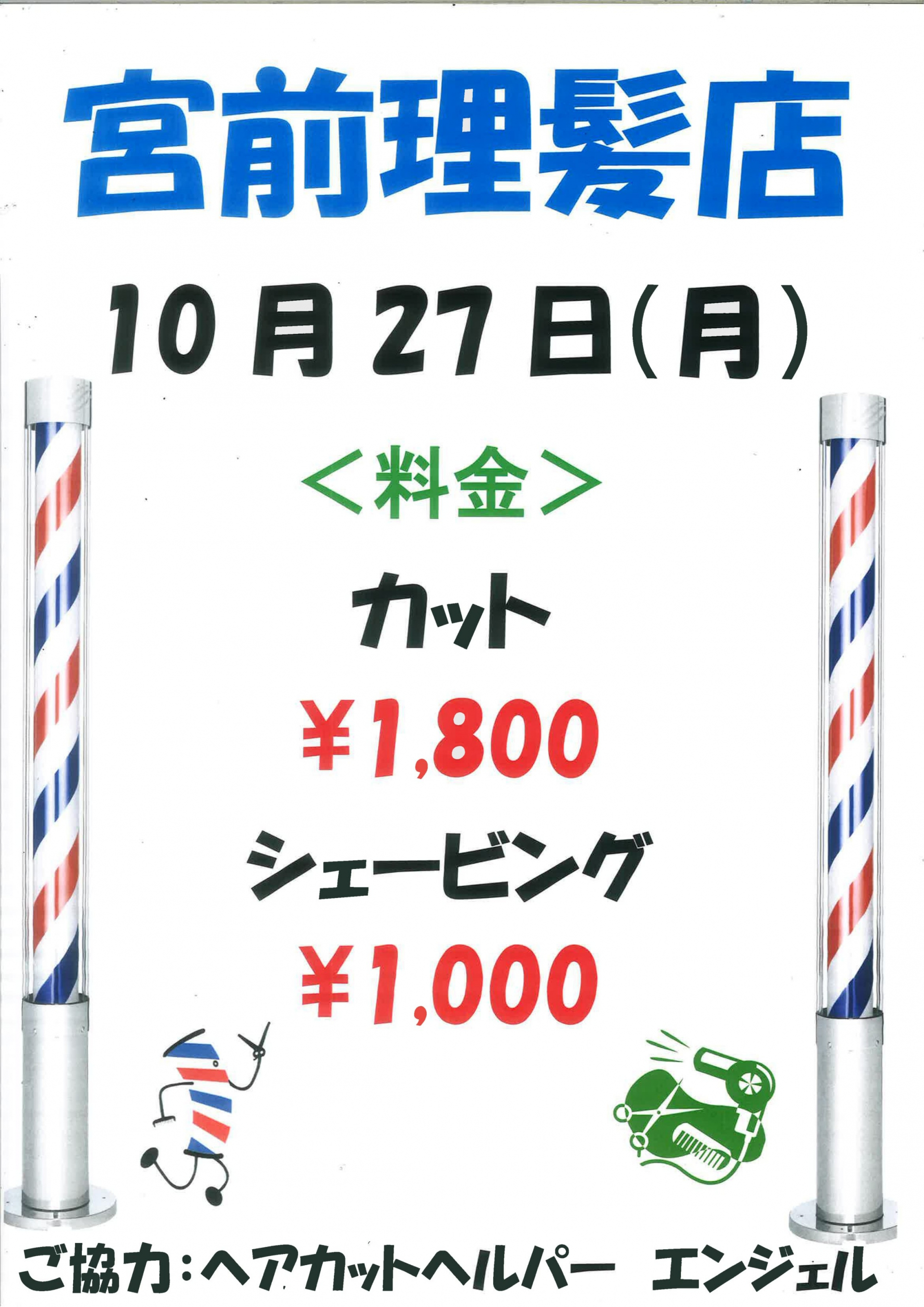 来週27(月)は、ヘアカットサービス「宮前理髪店」を開催いたします。
