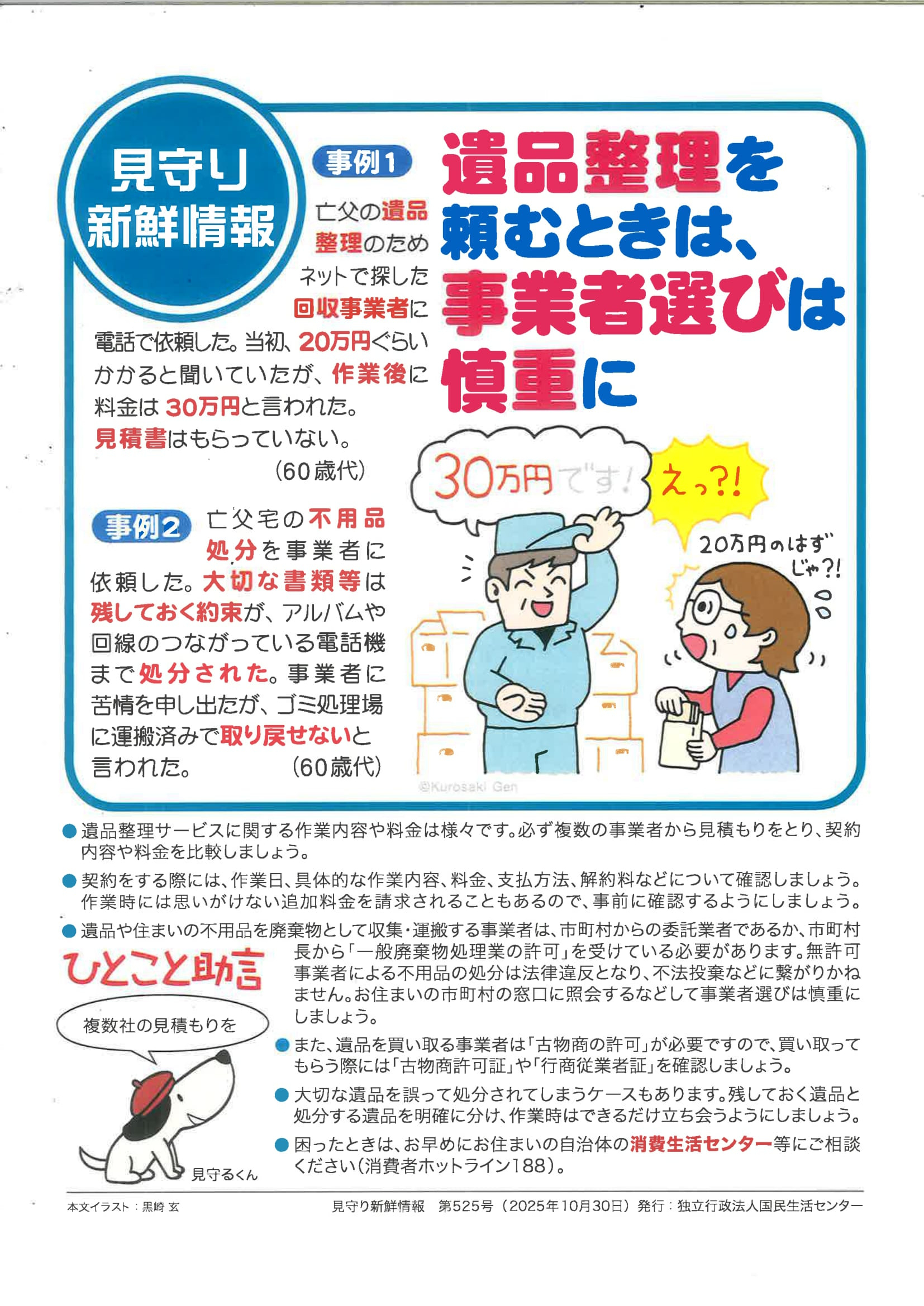 2025.10.31 ニュース 見守り新鮮情報 Tweet シェアする 独立行政法人国民生活センターより、「見守り新鮮情報 第525号」が発行されました。 遺品整理を頼むときは、事業者選びは慎重に 生活相談員 S 前の記事 2025.10.31 ニュース お昼ご飯〜 ハロウィンデイ 次の記事 2025.10.30 ニュース 本日午後の個別プログラム〜 一覧へ戻る