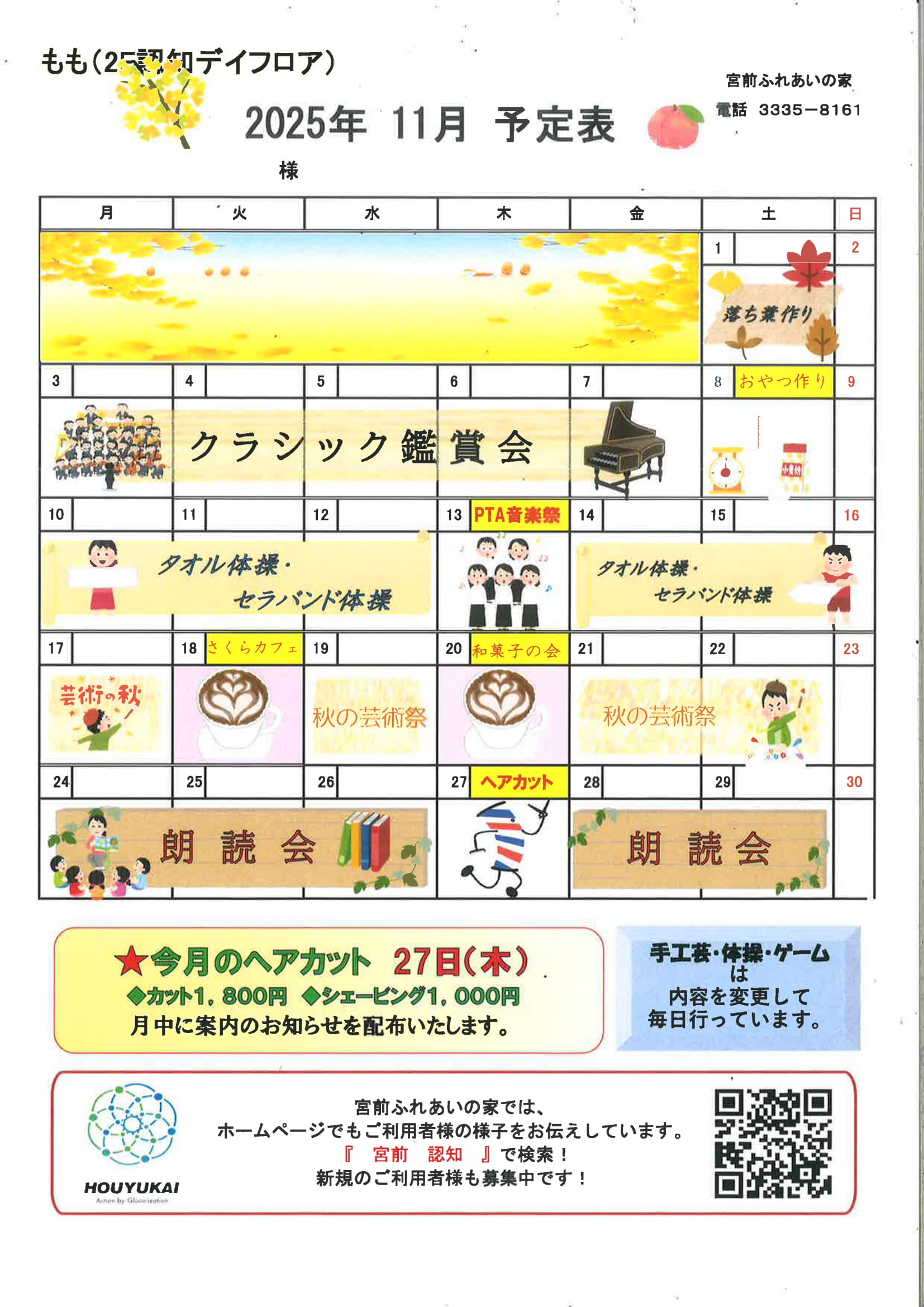 2025.11.01 お知らせ 11月の予定表 Tweet シェアする 認知デイ、11月の予定表です。 生活相談員 S 前の記事 2025.11.01 お知らせ 11月の献立表 次の記事 2025.10.31 お知らせ 午後のプログラムのご様子~ 一覧へ戻る