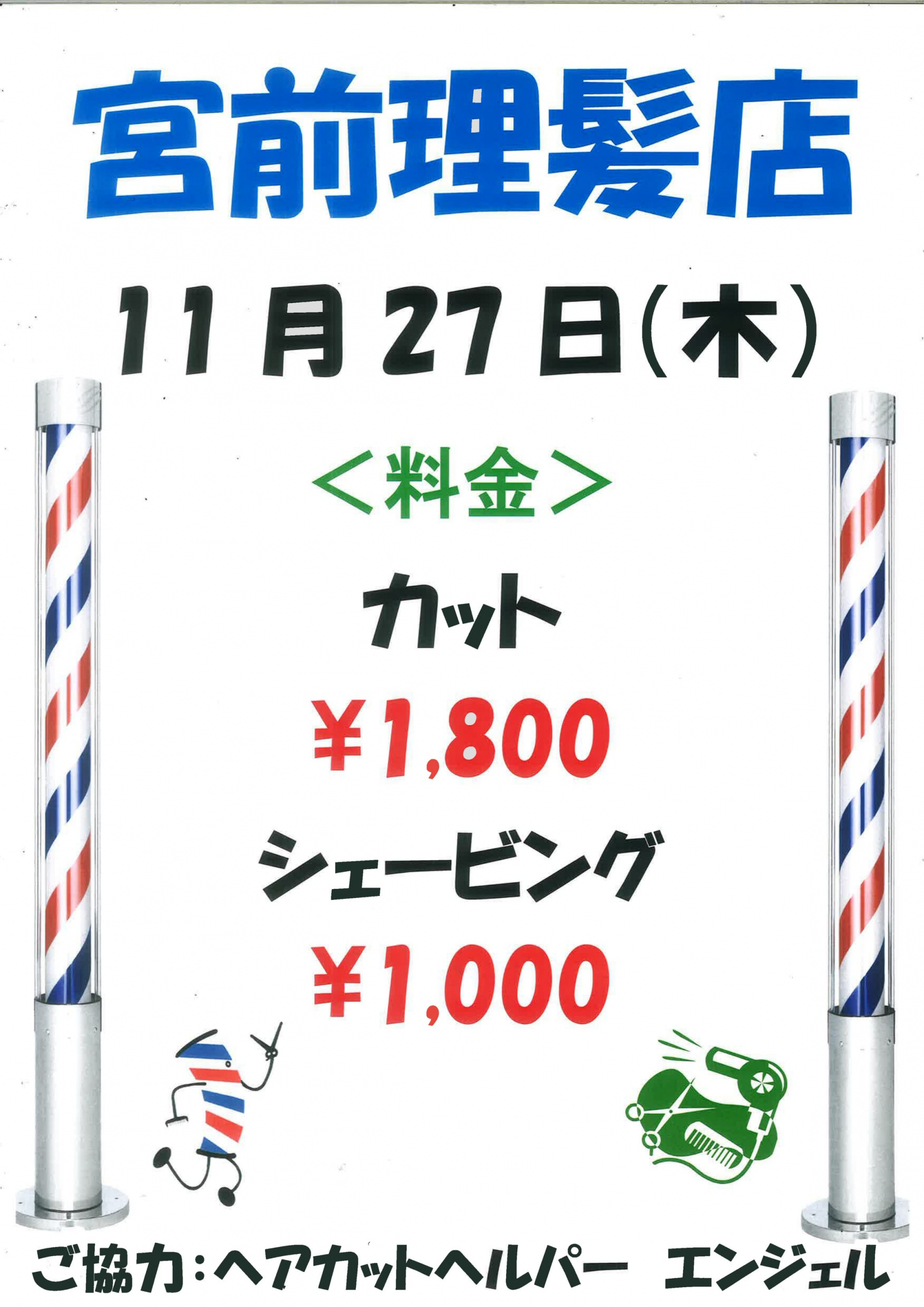 今月も、ヘアカットサービス「宮前理髪店」を開催いたします。