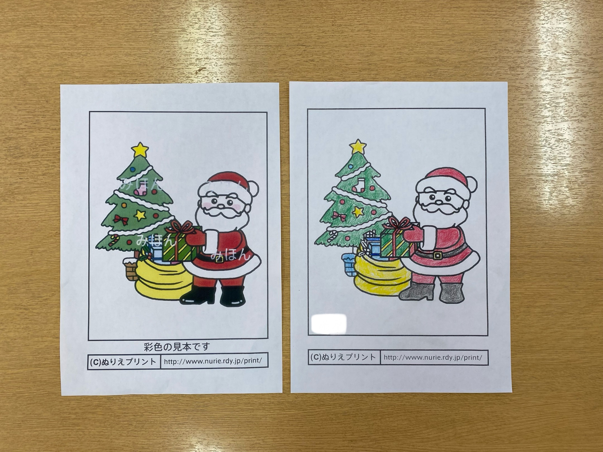 F様は、来月のクリスマスに向けてサンタクロースの塗り絵に取り組まれていました。