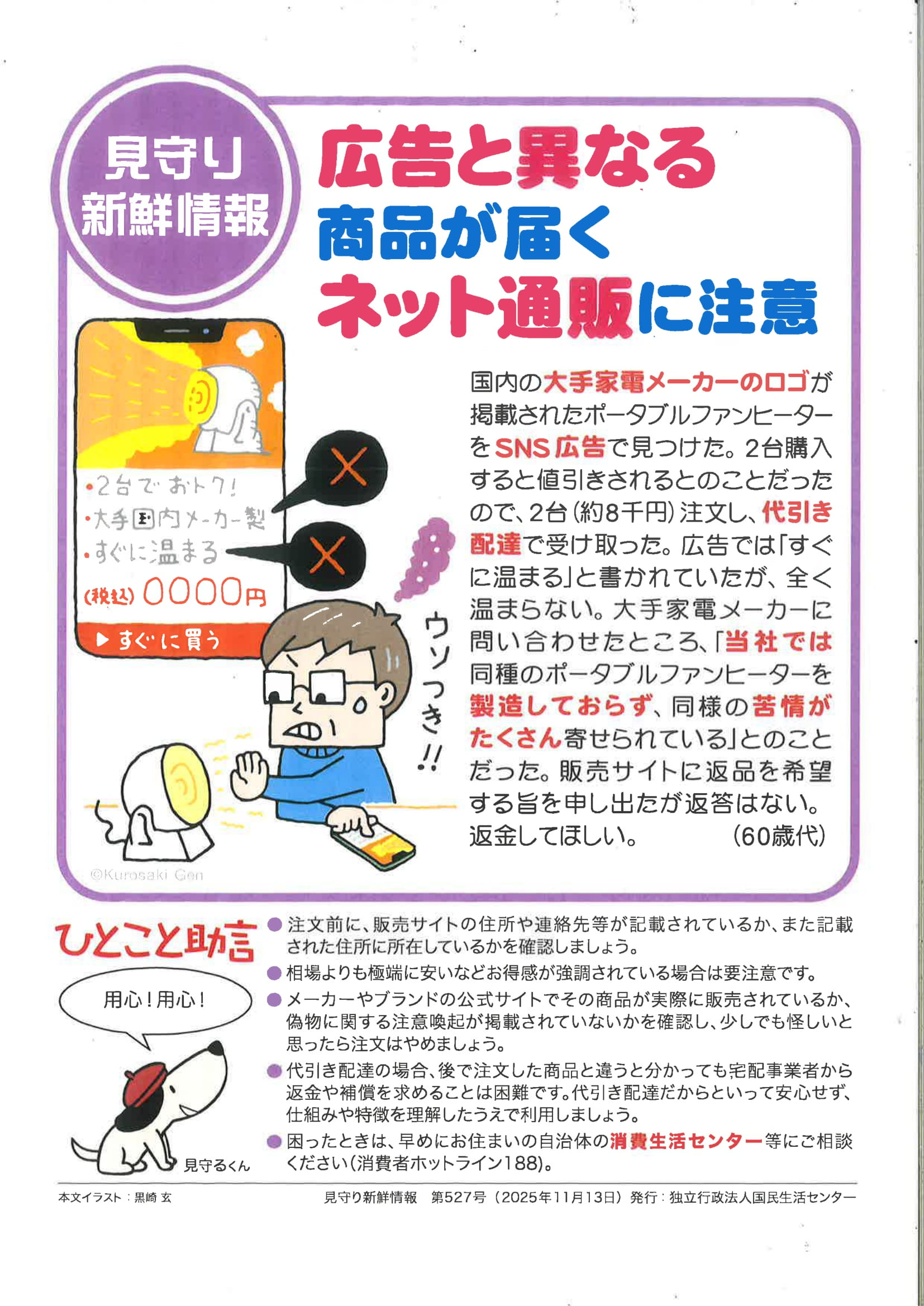 2025.11.13 ニュース 見守り新鮮情報 Tweet シェアする 独立行政法人国民生活センターより、「見守り新鮮情報 第527号」が発行されました。 広告と異なる商品が届くネット通販に注意 生活相談員 S 前の記事 2025.11.13 ニュース 午後のプログラムのご様子〜ビンゴゲーム! 次の記事 2025.11.12 ニュース 午後のプログラムのご様子〜 一覧へ戻る