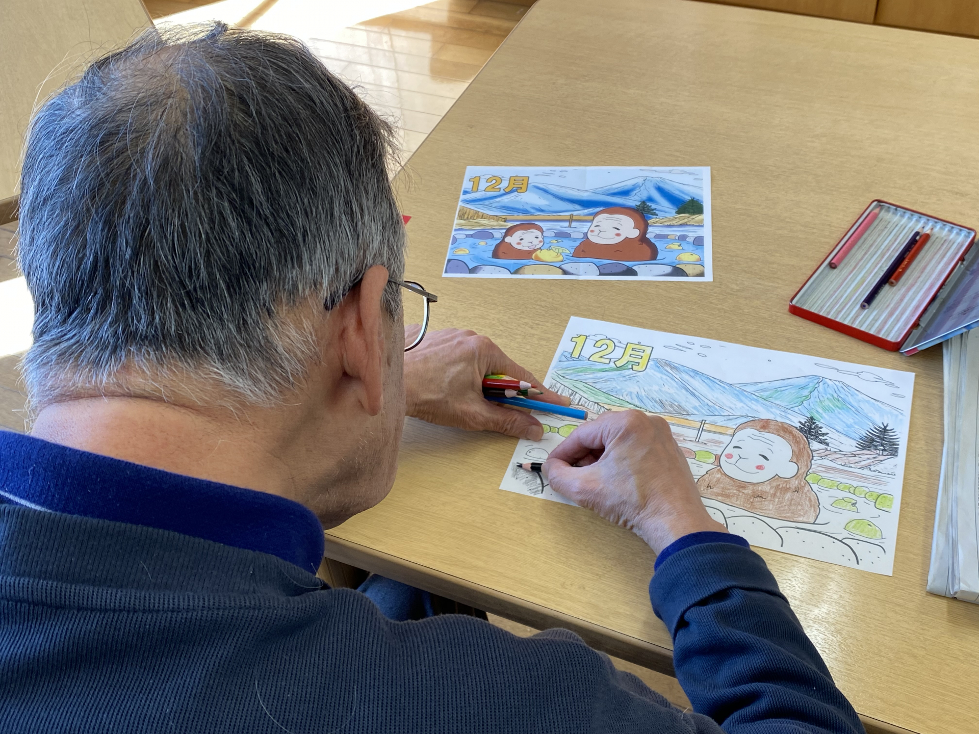 本日F様は、「12月の塗り絵」に取り組まれていました。見本を参考にしながら、集中して色を塗られていました。