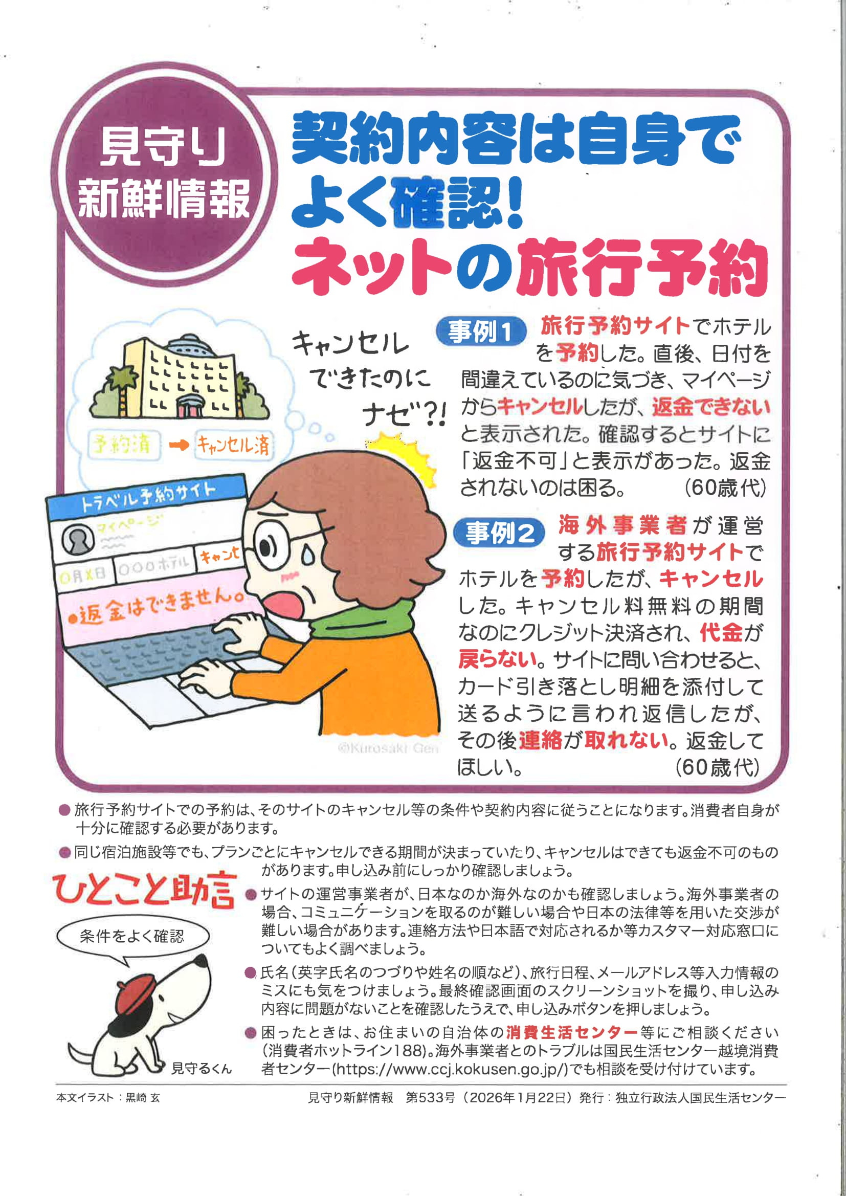 2026.01.22 ニュース 見守り新鮮情報 Tweet シェアする 独立行政法人国民生活センターより、「見守り新鮮情報 第533号」が発行されました。 契約内容は自身でよく確認!ネットの旅行予約 生活相談員 S 前の記事 2026.01.23 ニュース 新年会の特別のおやつです! 次の記事 2026.01.16 ニュース 歌会を行います! 一覧へ戻る