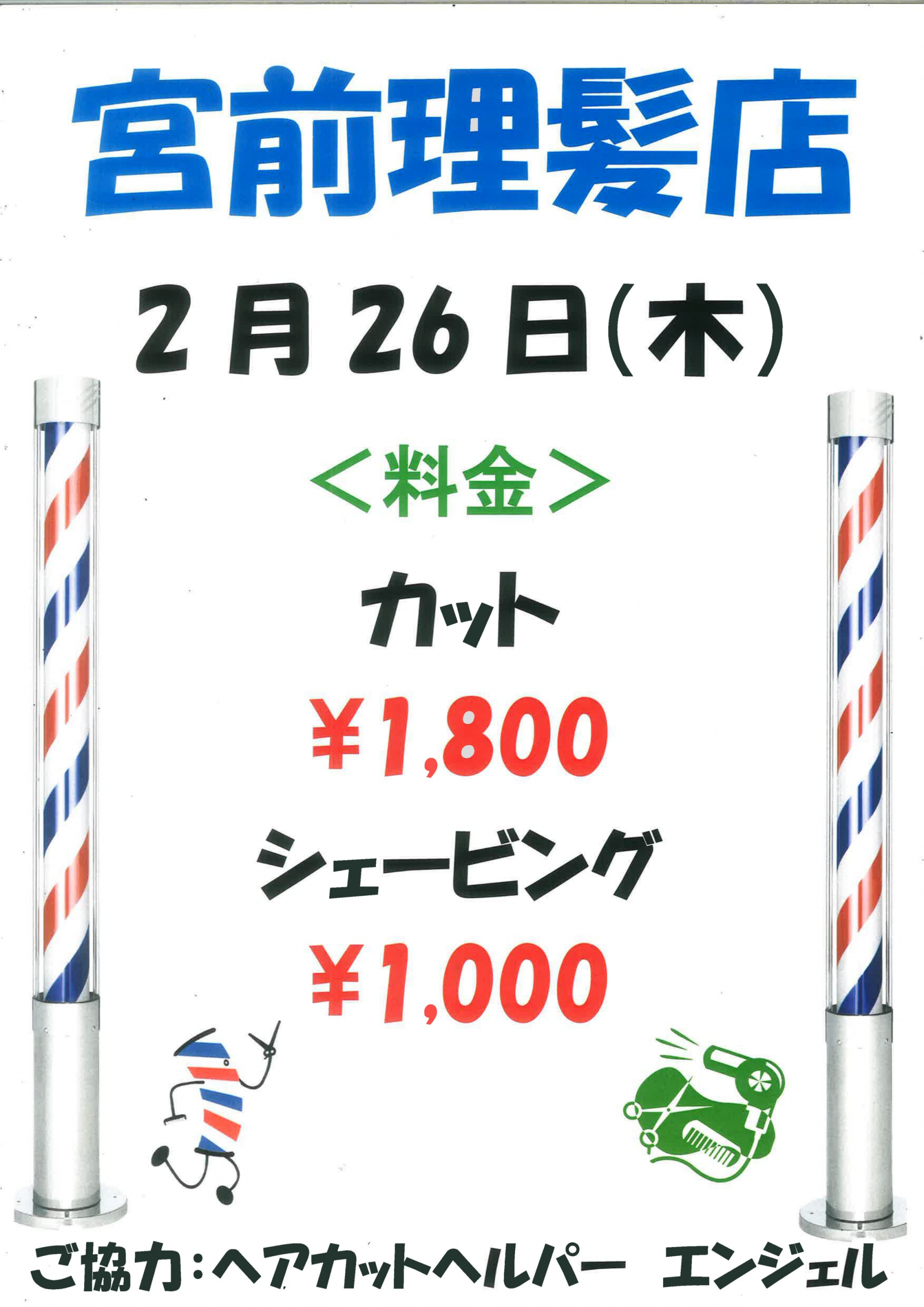 料 金:カット 1800円 シェービング 1000円