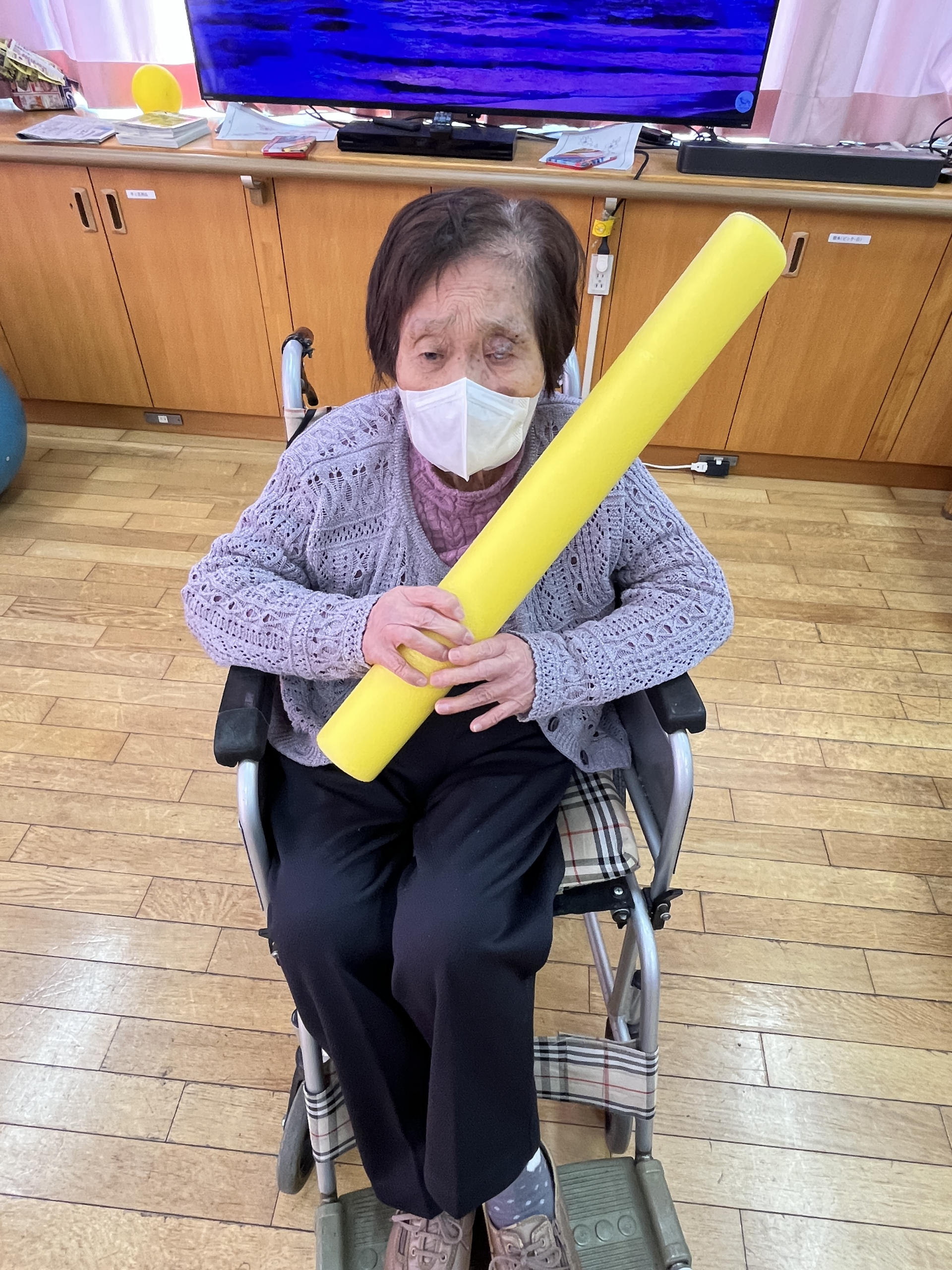 本日は「カラーポール」を使って体操とゲームを行っています。