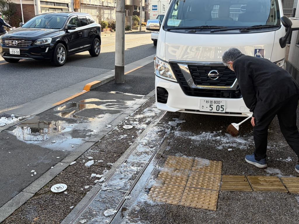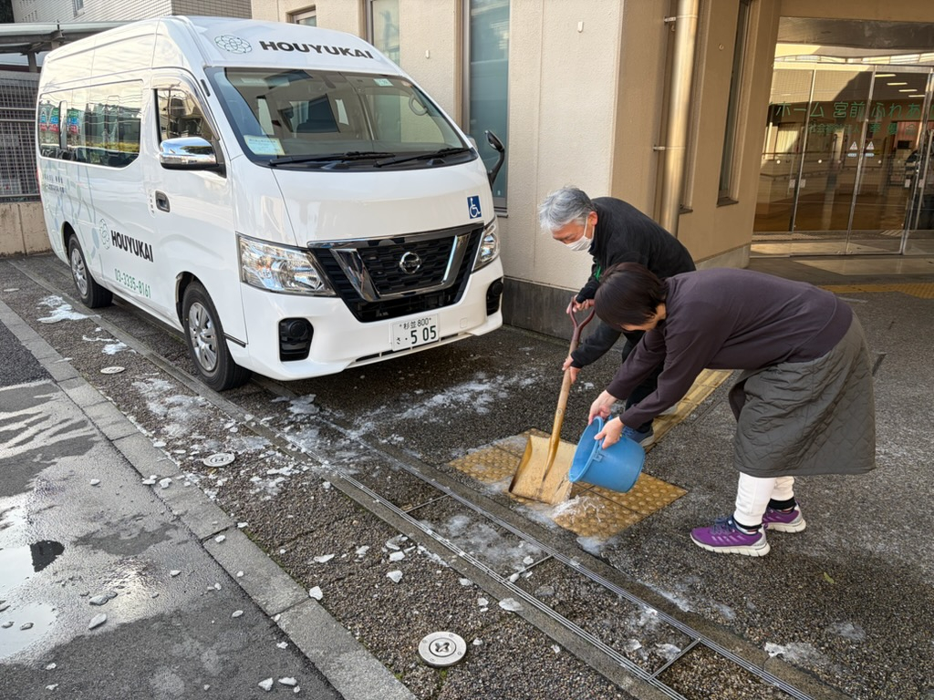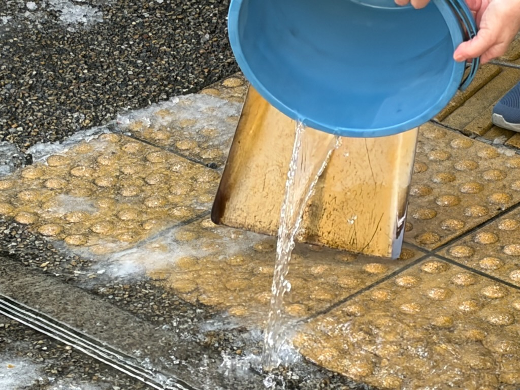 みなさんを快適にお迎えするため、施設責任者とドライバーが、お湯を使って取り除いています。