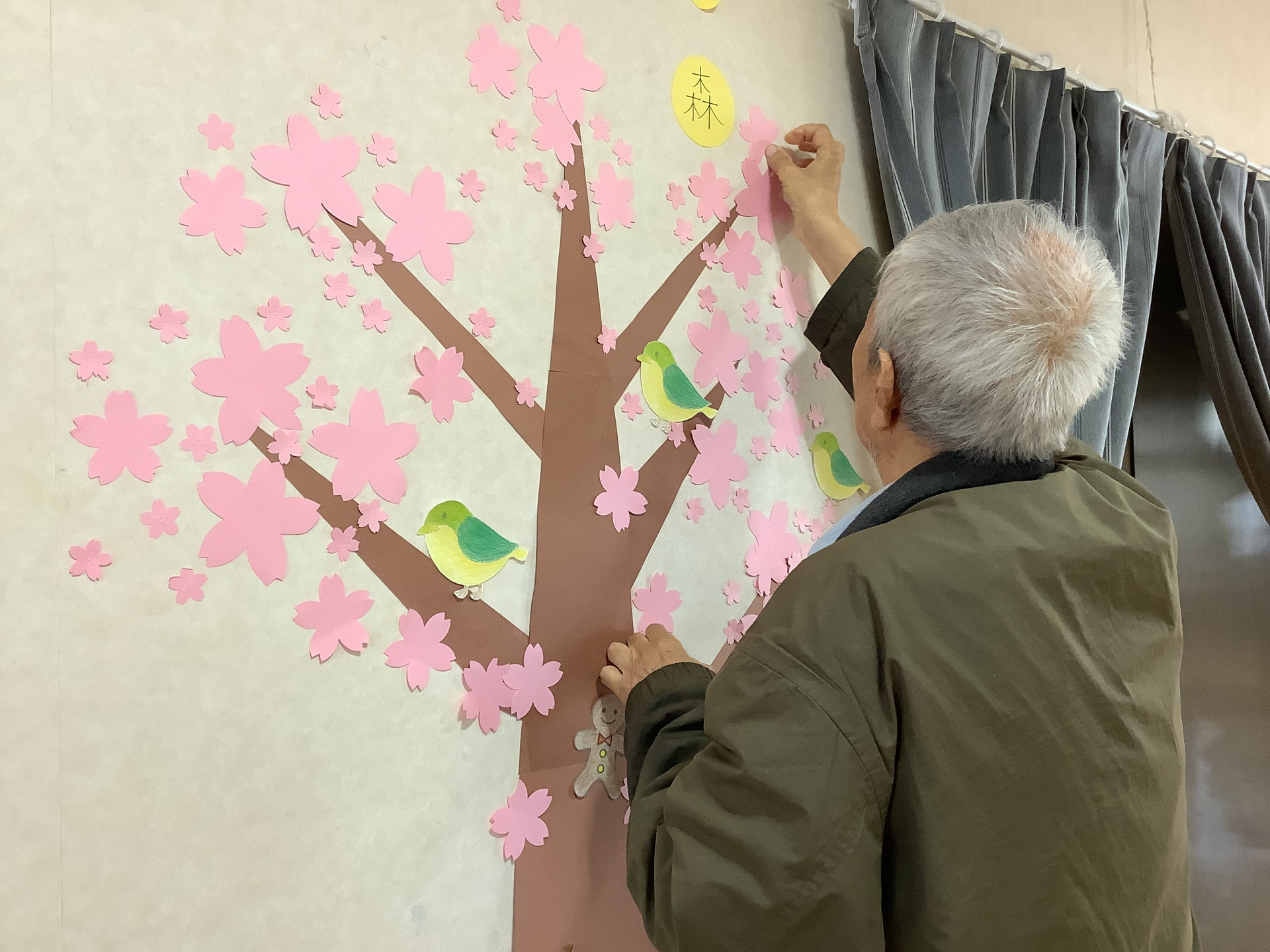 さて、本日は廊下の壁の桜の木に利用者様に協力して貰い、桜の花びらを貼っていただきました!